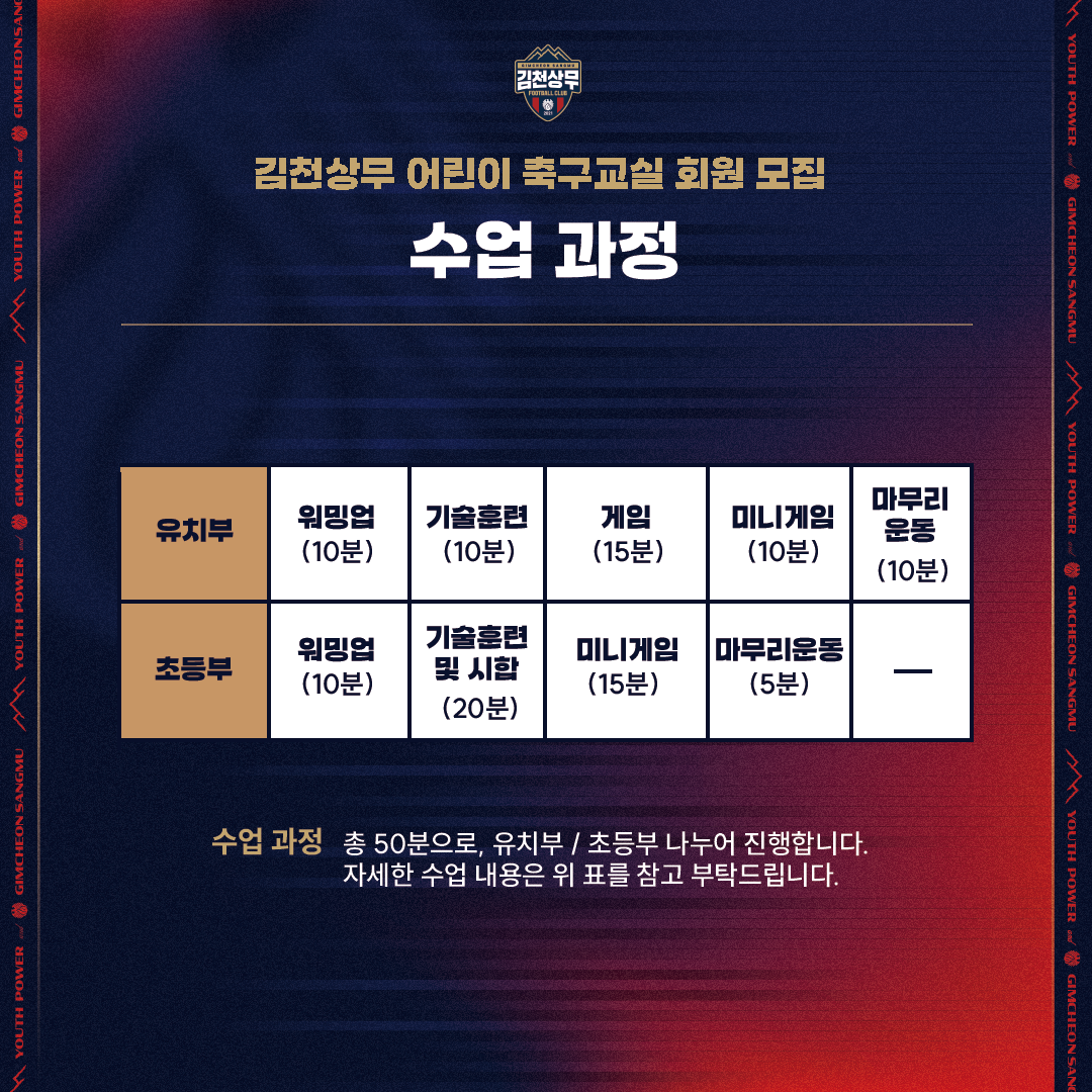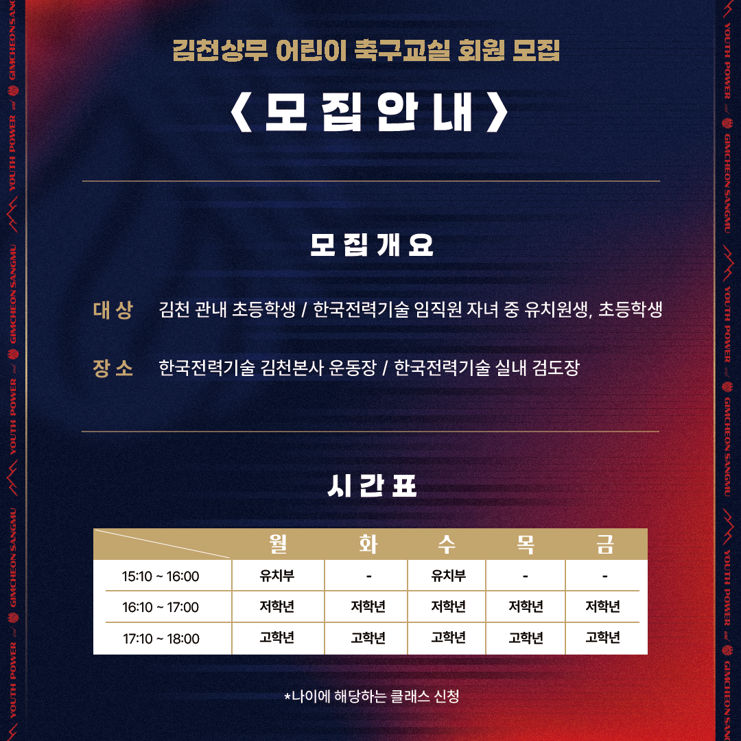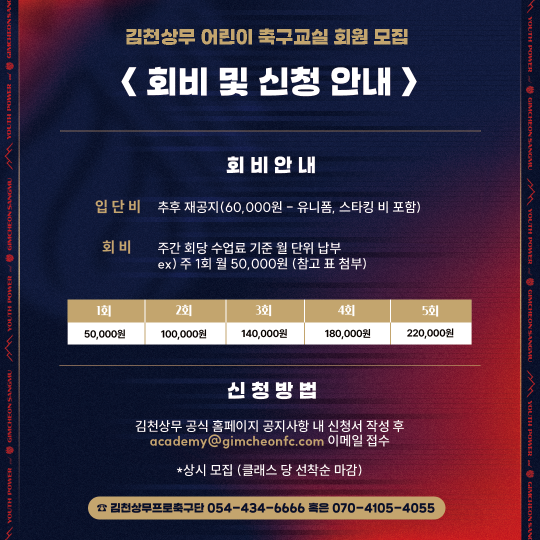 -회원 신청 방법 : 김천상무 공식 홈페이지 공지사항 내 신청서 작성 후 academy@gimcheonfc.com 으로 이메일 접수 (클래스 당 선착순 접수)