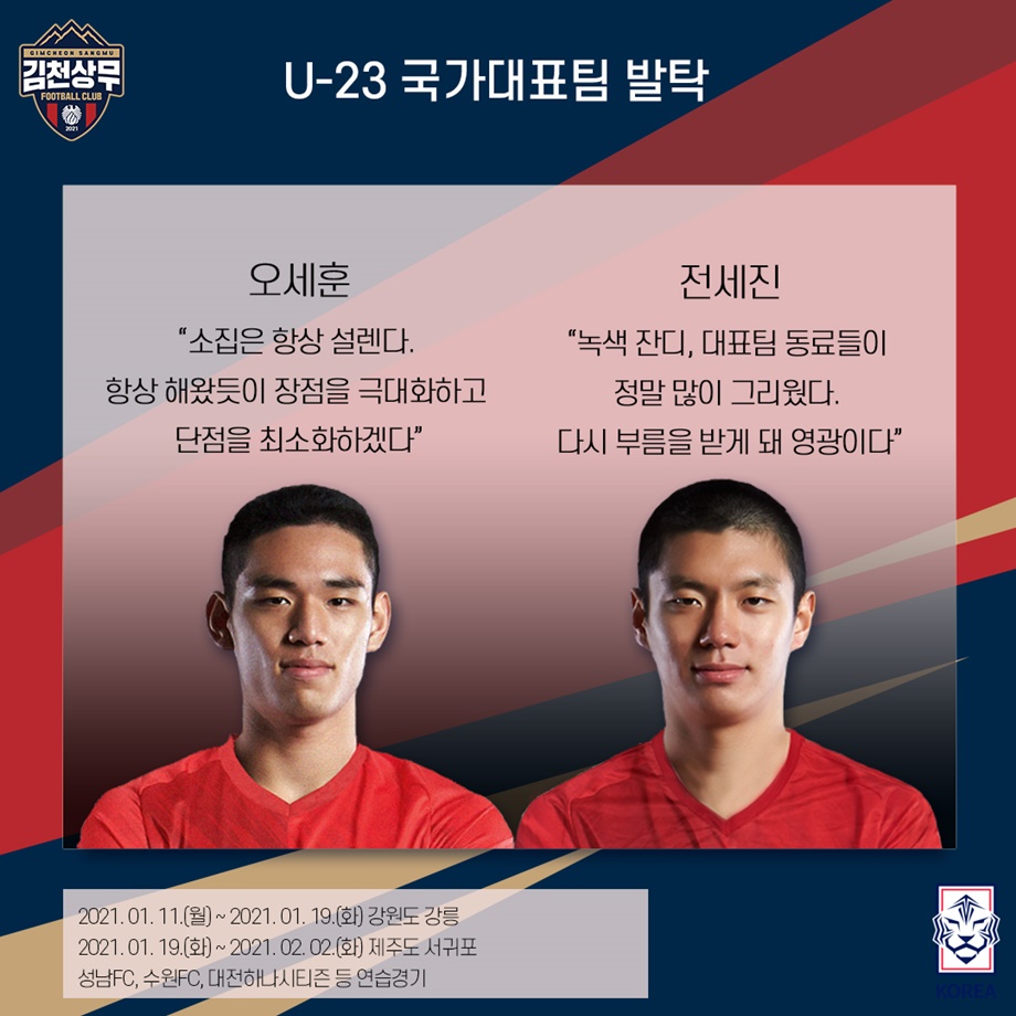 대한축구협회는 5일, 2021년 첫 소집 훈련에 참가할 U-23 대표팀 전지훈련 명단을 발표했다. 김천상무프로축구단(대표이사 배낙호) 오세훈, 전세진이 U-23 명단에 포함됐다. 김학범 감독이 이끄는 U-23 대표팀은 오는 11일부터 19일까지 강릉에서 1차 훈련을, 19일부터 내달 2일까지 서귀포에서 2차 훈련을 진행한다.