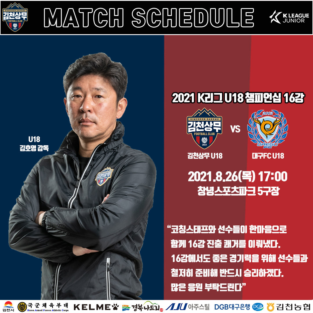김천상무프로축구단 U18(경북미용예술고) 팀은 20일부터 30일까지 경남 창녕시에서 열리는 ‘2021 K리그 U18 챔피언십’에 출전하고 있다. K리그 챔피언십은 한국프로축구연맹과 대한축구협회가 주최하고 한국프로축구연맹이 주관하는 대회로 K리그 프로 산하 U18 22개 팀이 참가한다.