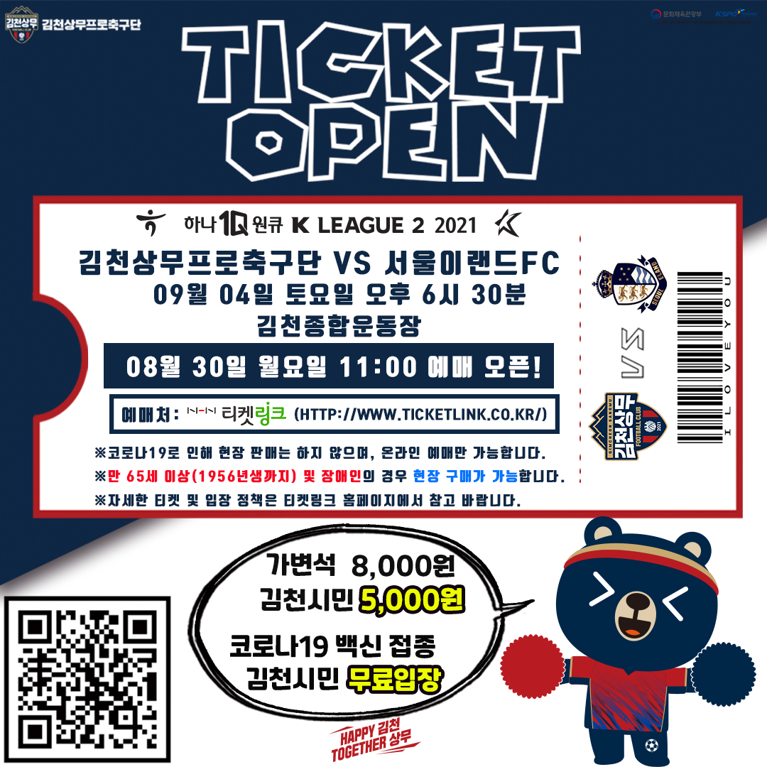 김천상무프로축구단(대표이사 배낙호)이 30일 오전 11시, 온라인 예매 사이트 티켓링크를 통해 내달 4일 오후 6시 30분 김천종합운동장에서 열리는 ‘하나원큐 K리그2 2021’ 28R 서울이랜드FC와 홈경기 온라인 예매를 시작했다.