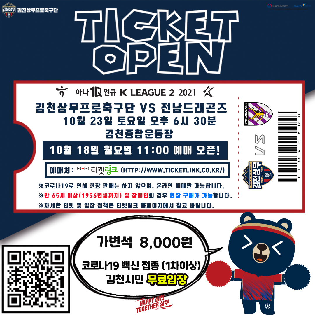 김천상무프로축구단(대표이사 배낙호)이 18일 오전 11시, 온라인 예매 사이트 티켓링크를 통해 23일 오후 6시 30분 김천종합운동장에서 열리는 ‘하나원큐 K리그2 2021’ 35R 전남드래곤즈와 홈경기 온라인 예매를 시작한다.