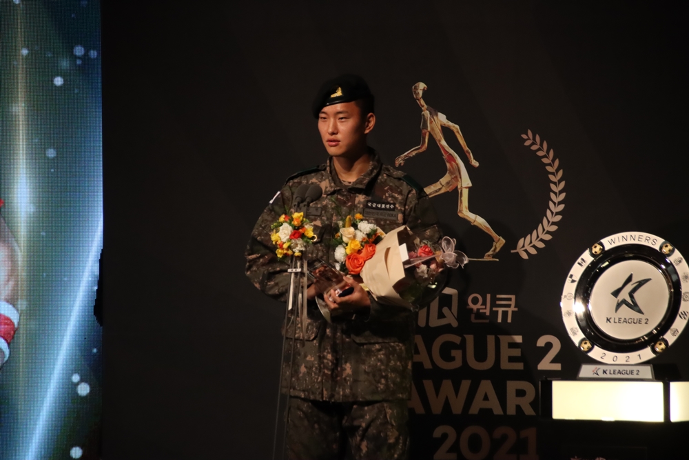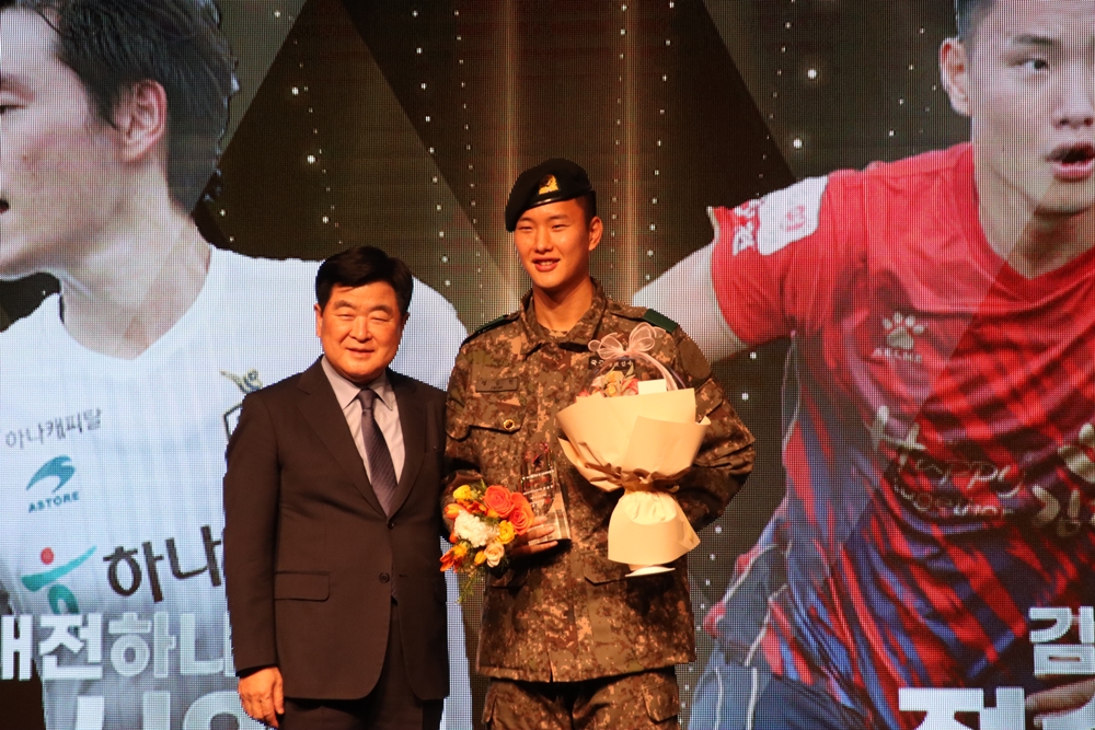 이어 정승현은 “김충섭 구단주님, 곽합 부대장님을 비롯해 시상식에 참석하신 배낙호 대표이사님께도 감사하다. 항상 도움주시는 오세진 선수단 주무, 에이전트에게도 감사하다. 마지막으로 군대라는 환경 속에서 항상 좋은 분위기를 만들어주시고 긍정적인 에너지, 동기부여를 주시는 펩태완 김태완 감독님께 감사드린다”고 수상 소감을 전했다.