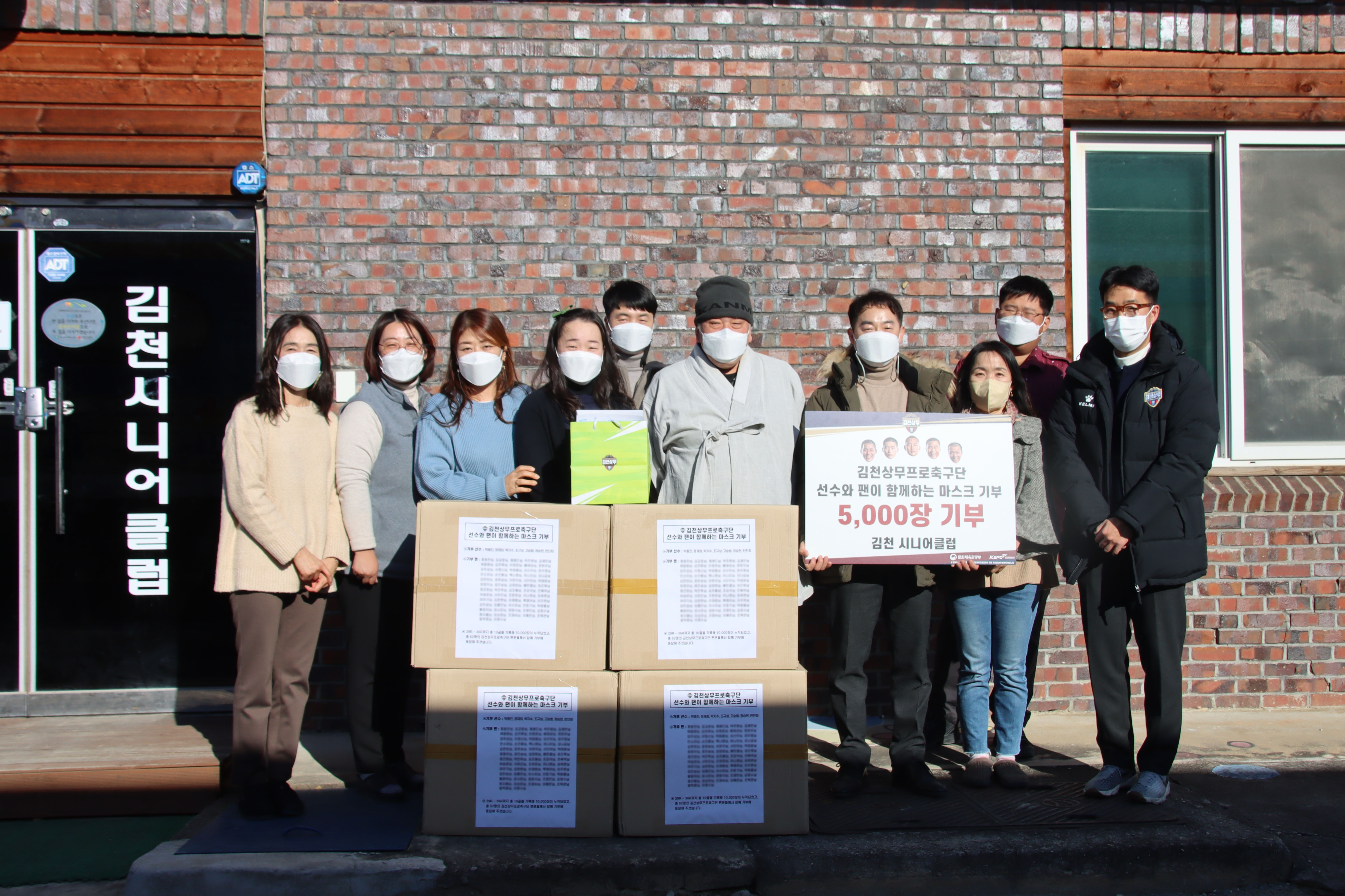 김천상무는 1만 장의 마스크를 김천시 노인종합복지관과 김천 시니어클럽에 각 5천 장씩 전달했다. 코로나 확산 증가 및 방역지침 강화 상황에서 마스크 기부를 통해 지역 사회 안전을 확보하기 위함이다.