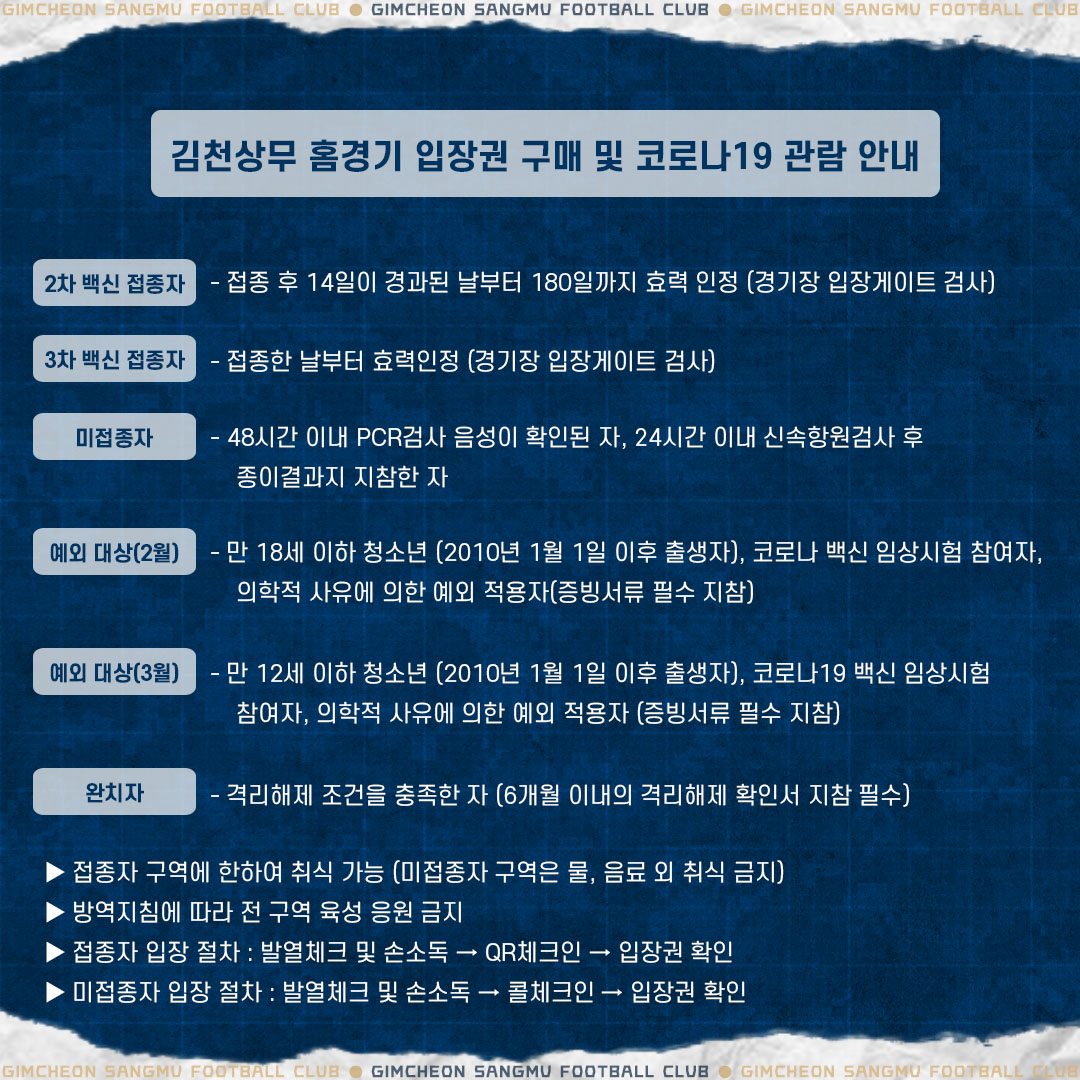 김천상무는 백신 접종자 구역과 백신 미 접종자 구역을 나눠서 운영한다. 백신 접종자 구역은 테이블 석, 가변석, 일반석(B구역)이며 거리두기 없이 100% 개방하고 취식도 가능하다. 미 접종자 구역은 일반석(I구역), 원정석이며 50% 개방한다.