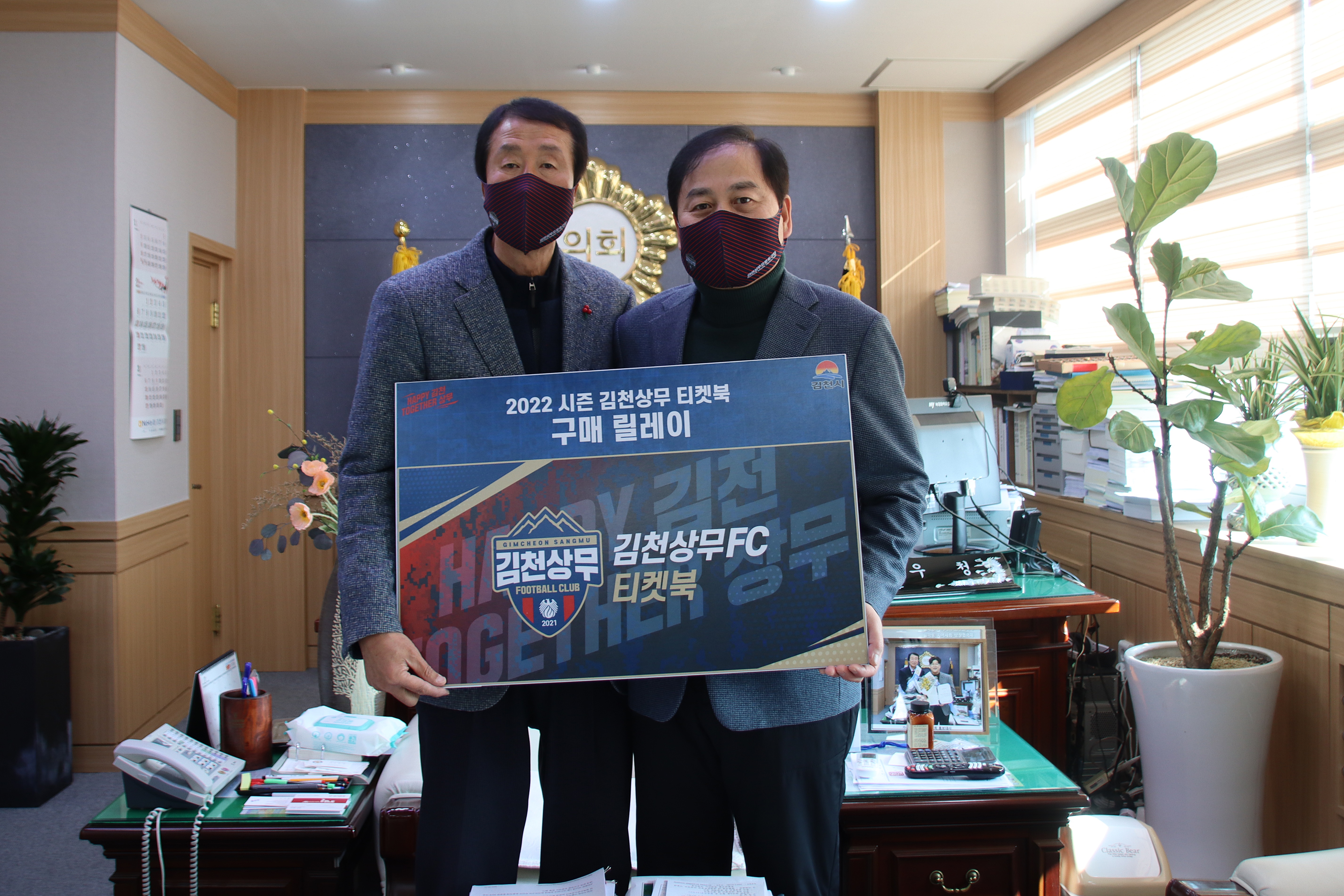 김천상무프로축구단이 25일 오전 10시 30분 김천시의회에서 이우청 김천시의회 의장, 나영민 부의장, 박영록 행정복지위원장, 이복상 산업건설위원장의 티켓북 구매 릴레이 행사를 열었다. 김천상무 구단주, 후원회장, 대표이사, 단장과 김천시 내 고위 관계자들에 이어 김천시의회가 티켓북 구매 릴레이에 동참했다.