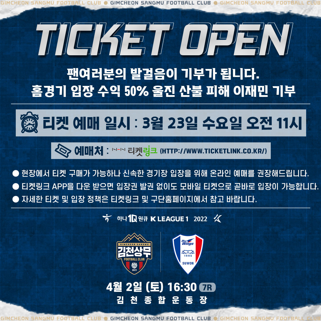 김천상무프로축구단(대표이사 배낙호)이 23일 오전 11시, 온라인 예매 사이트 티켓링크를 통해 내달 2일 오후 4시 30분, 김천종합운동장에서 열리는 ‘하나원큐 K리그1 2022’ 7R 수원삼성과 홈경기 티켓 예매를 시작한다.