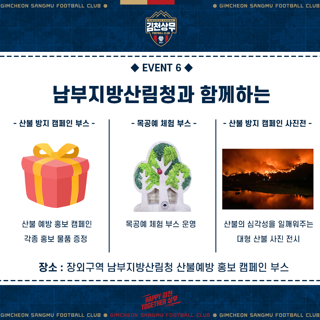 김천상무프로축구단(대표이사 배낙호)이 2일 오후 4시 30분, 김천종합운동장에서 ‘하나원큐 K리그1 2022’ 7R 수원삼성과 홈경기를 치른다. 식목일(청명·한식)을 앞두고 치르는 경기인 만큼 김천상무는 남부지방산림청과 함께 산불예방 홍보와 다양한 이벤트를 준비한 캠페인을 진행한다.