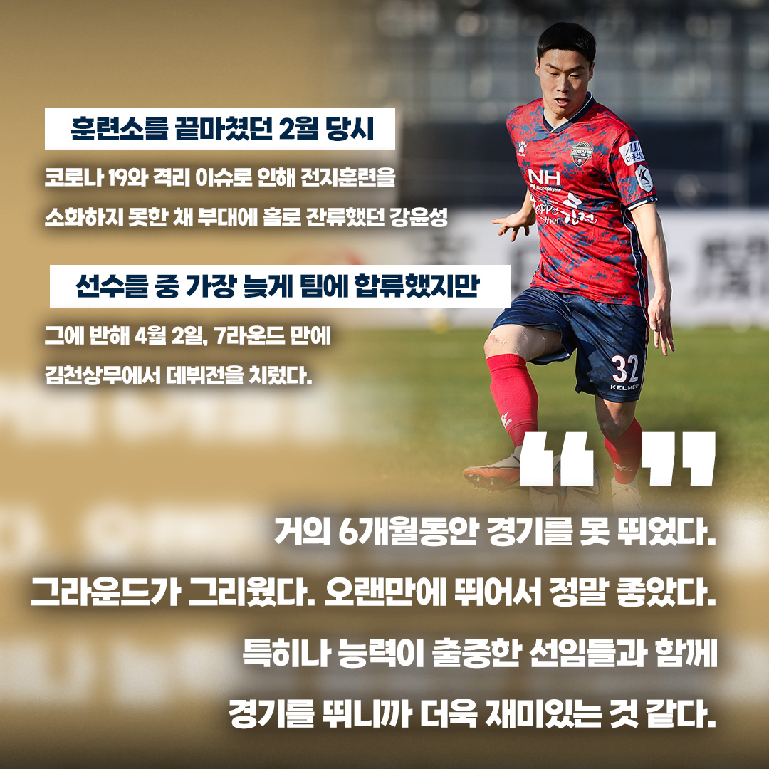 훈련소를 끝마쳤던 강윤성은 2월 당시, 코로나19와 격리 이슈로 인해 전지훈련을 소화하지 못한 채 부대에 홀로 잔류했었다. 강윤성은 30명의 선수들 중 가장 늦게 팀에 합류했지만 그에 반해 4월 2일, 7라운드 만에 김천상무에서 데뷔전을 치렀다.