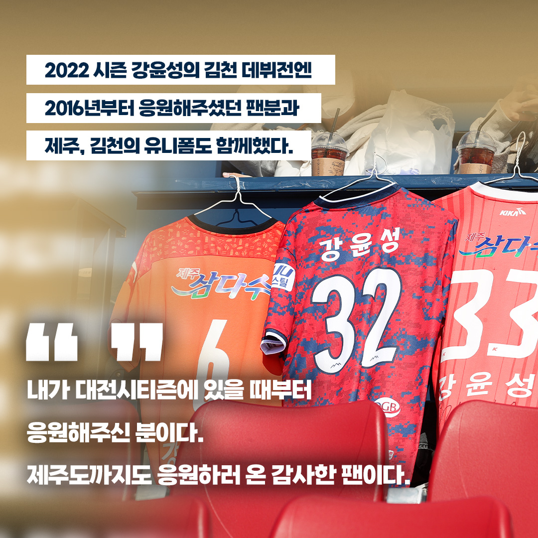강윤성의 김천 데뷔전에는 강윤성의 팬이 걸어둔 제주, 김천의 유니폼이 함께했다. 홈경기에서 강윤성이 힘을 낼 수밖에 없는 이유다. 강윤성은 “내가 대전시티즌에 있을 때부터 응원해주신 분이다. 제주도까지도 응원하러 온 감사한 팬이다”고 설명했다.
