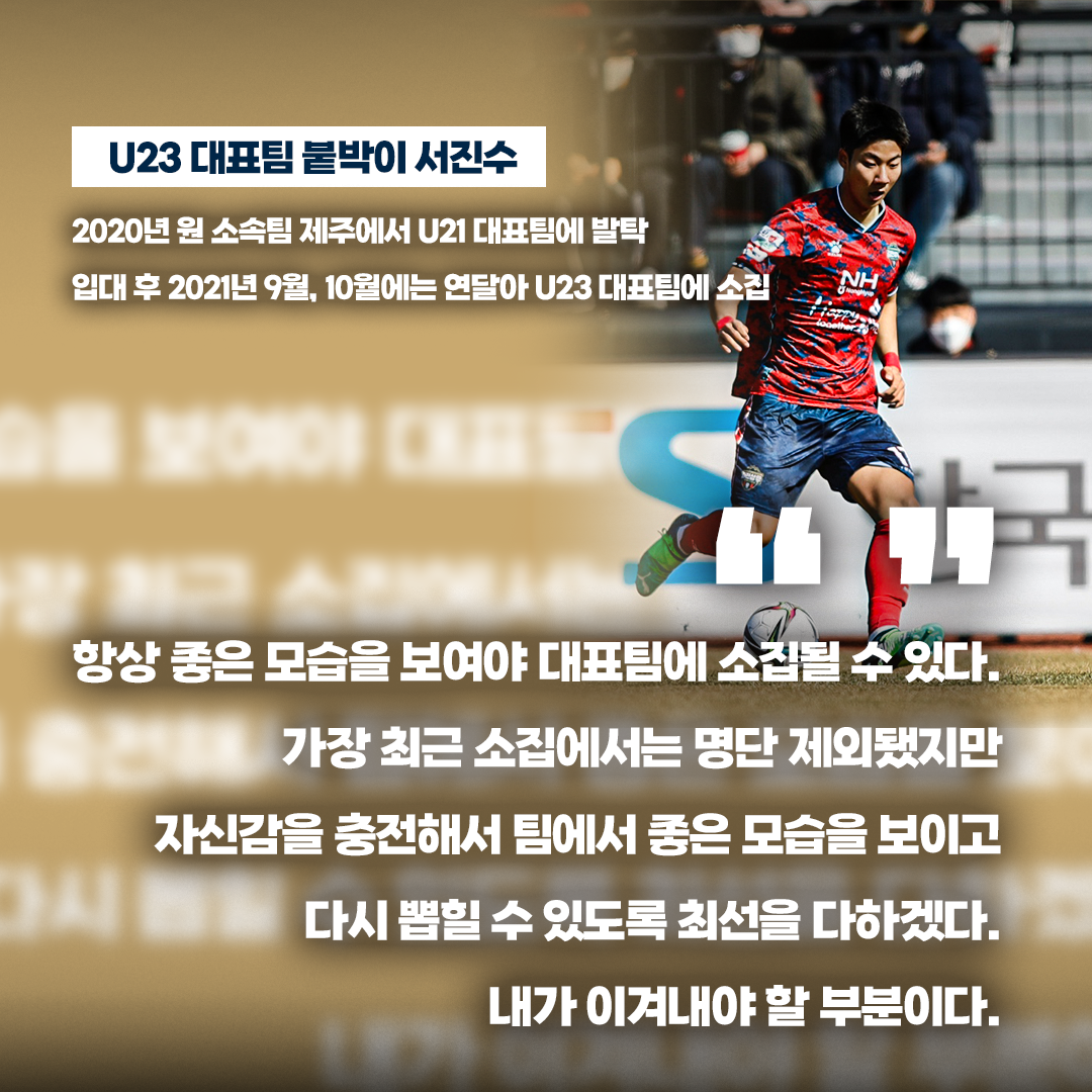 출전 기록도 경신했다. 훈련 소집에서 더 나아가 지난해 10월, ‘2022 아시안컵 예선’ 두 경기에 출전하며 모두 승리로 이끌었다. 2014 AFC U-14 챔피언십(예선)이 마지막이었던 서진수는 7년 만에 대표팀 유니폼을 입고 다시 그라운드에 섰다.