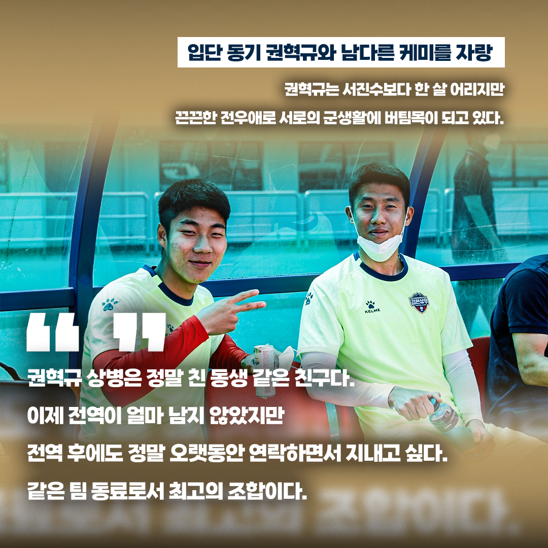 김천에서의 전역을 5개월도 남기지 않은 서진수는 입단 동기 권혁규와도 남다른 케미를 자랑했다. 권혁규는 서진수보다 한 살 어리지만 끈끈한 전우애로 서로의 군생활에 버팀목이 되고 있다.