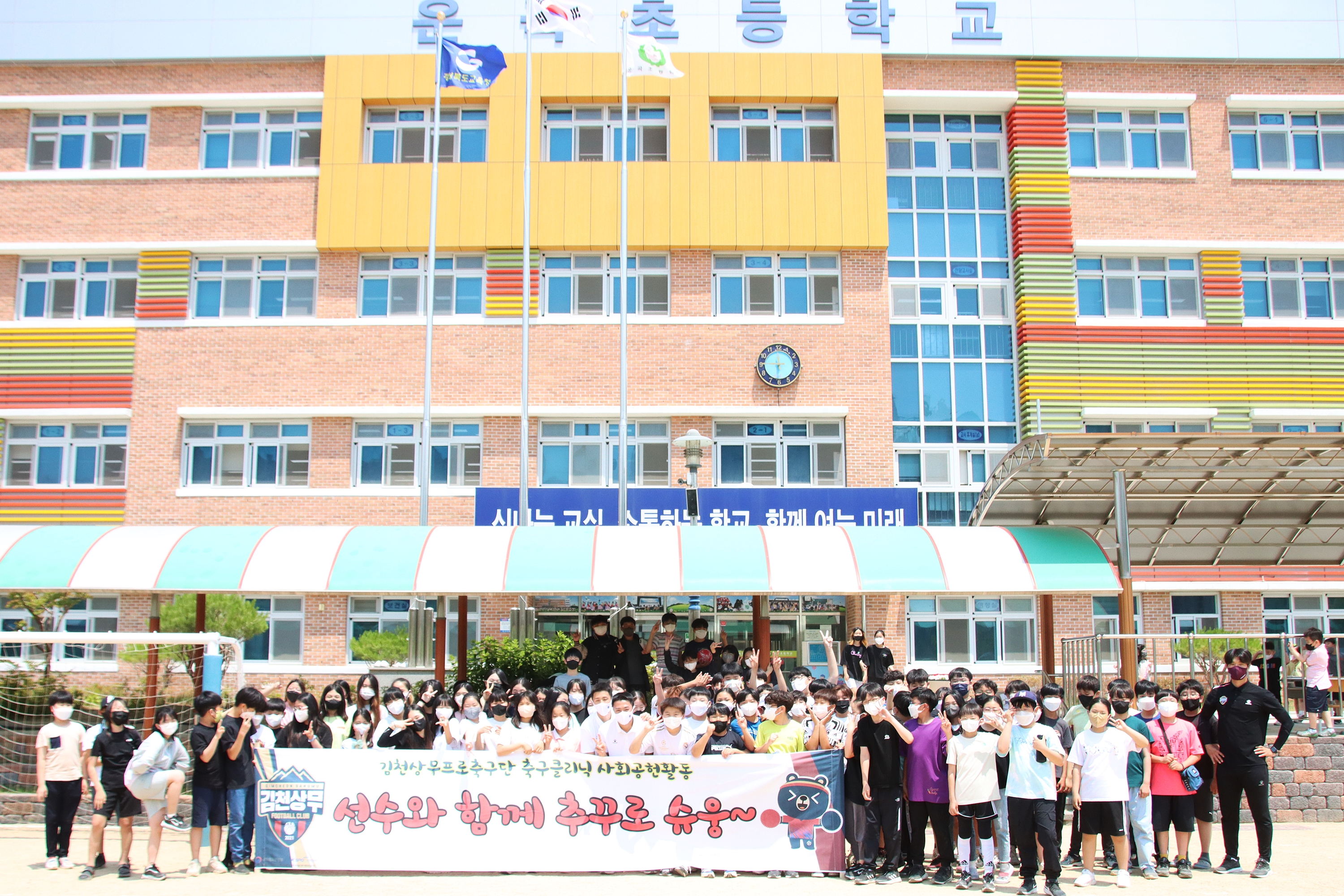 김천상무는 코로나19 거리두기 단계가 완화됨에 따라 프로축구선수가 참여하는 공식 사회공헌활동을 실시하고 있다. ‘선수와 함께 추꾸로 슈웅’ 사회공헌활동은 학교를 방문해 프로축구선수들이 축구를 가르쳐주는 활동이다.