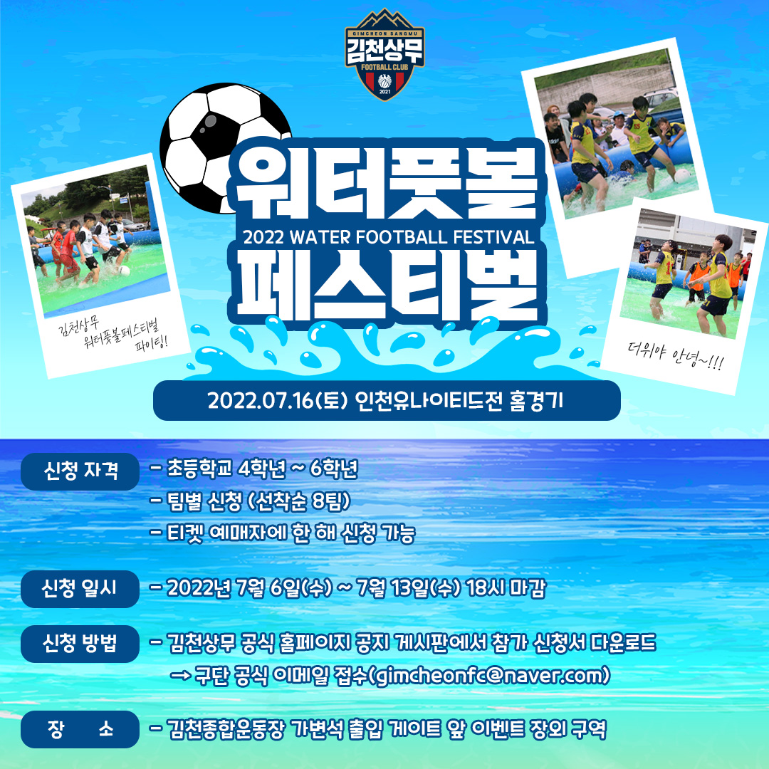 김천상무가 인천전 홈경기에서 워터풋볼 페스티벌에 참가할 초등학생을 모집한다.