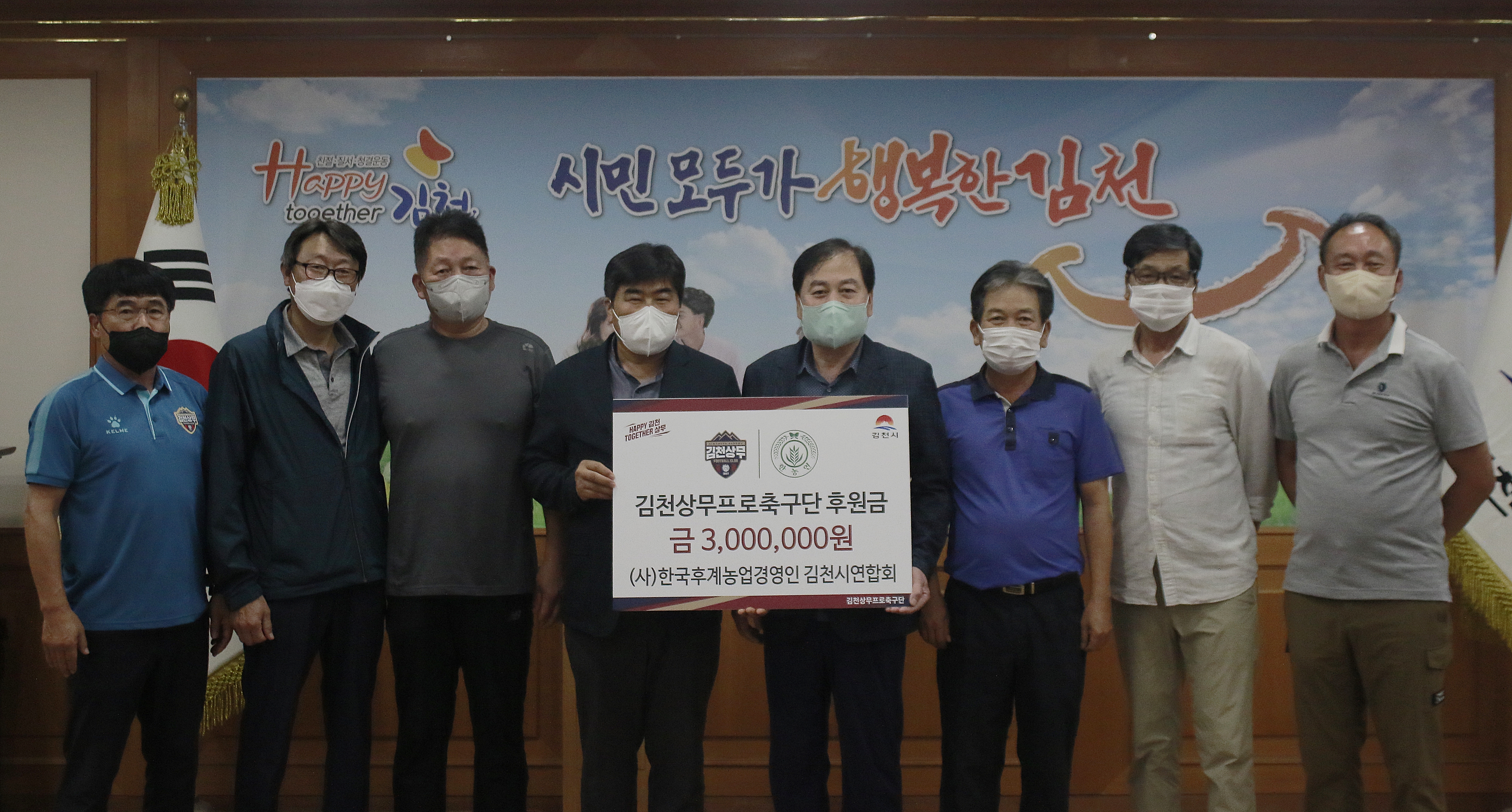 김천상무프로축구단이 26일 오후, 김천시청 2층 접견실에서 (사)한국후계농업경영인 김천시연합회의 후원금 전달식을 진행했다. 후원금 전달식에는 최진호 (사)한국후계농업경영인 김천시연합회장, 김진희 정책부회장, 최영식 대외협력부회장, 나명훈 감사, 여환익 감사, 강윤모 연구위원, 배낙호 김천상무 대표이사, 이흥실 단장이 참석했다.