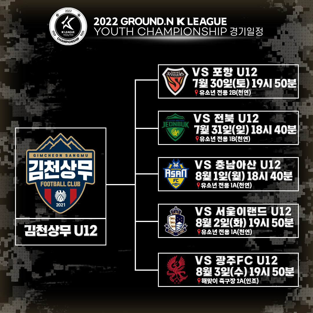김천상무프로축단 U12 팀은 오는 30일부터 내달 4일까지 경북 영덕군 일원에서 열리는 2022 GROUND.N K리그 U12 챔피언십에 참가한다. K리그 유스 챔피언십은 프로축구연맹이 주최하고, 주관하는 대회로 총 22구단의 K리그 프로 산하 유소년팀이 참가하며 풀리그 방식으로 진행된다.