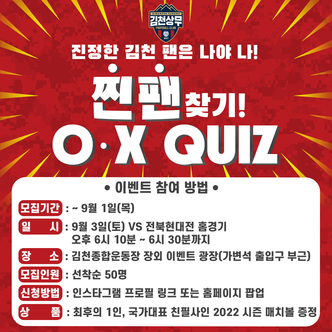 퀴즈는 김천상무 관련 내용들로 구성되며 O,X 퀴즈 최후의 1인에게는 국가대표 친필 사인이 담긴 2022 시즌 매치볼을 증정한다.