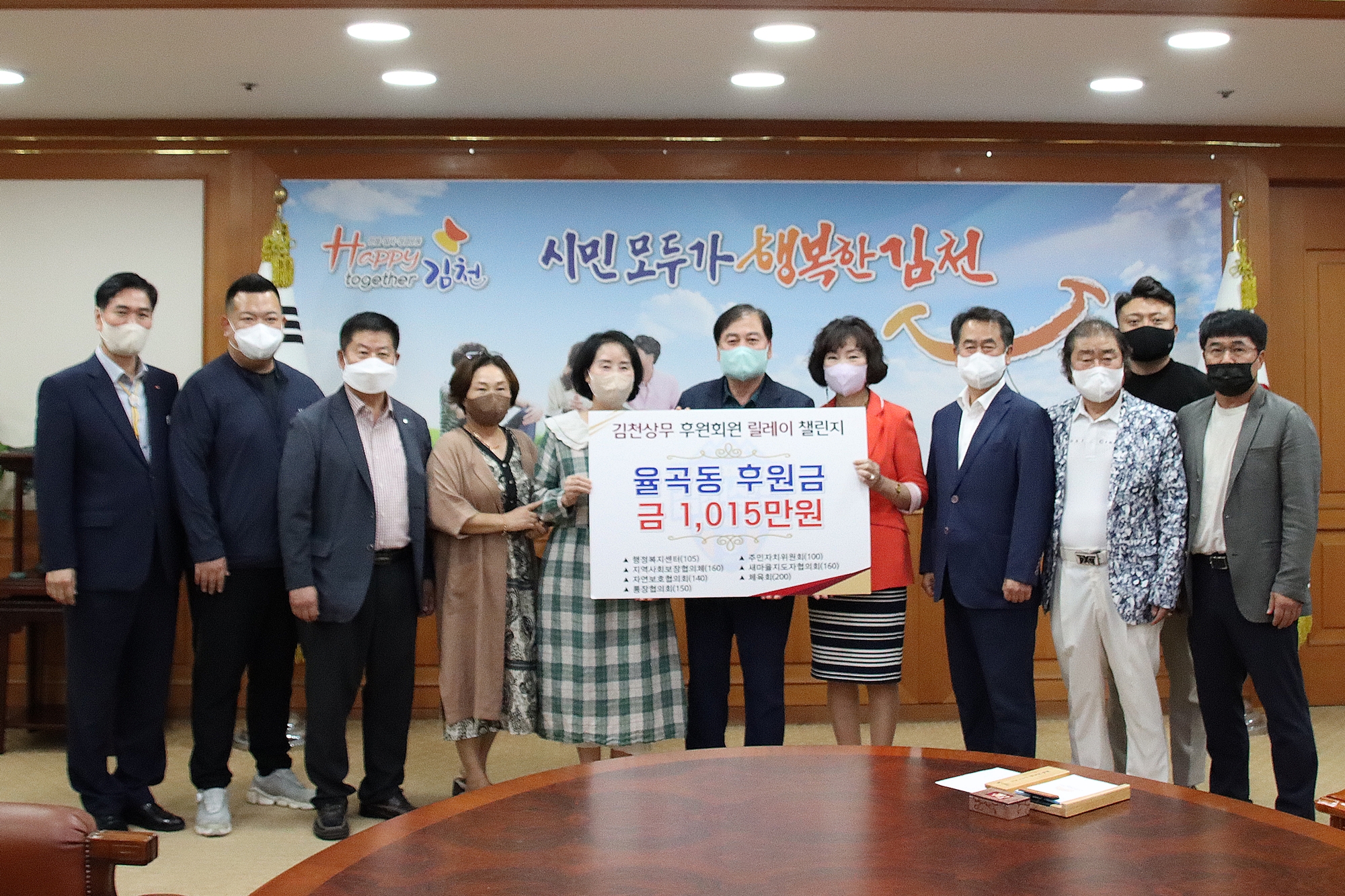 율곡동 체육회는 200만원, 지역사회보장협의체, 새마을지도자협의회는 각 160만원, 통장협의회는 150만원, 자연보호협의회는 140만원, 행정복지센터는 105만원, 주민자치위원회는 100만원. 율곡동에서는 총 1,015만원을 십시일반해 후원회원에 가입했다. 김천시 율곡동은 행정복지센터를 필두로 김천상무 릴레이 후원 챌린지를 열어 각 관변단체들의 후원회원 가입을 독려해 1,015만원의 후원금을 모았다.