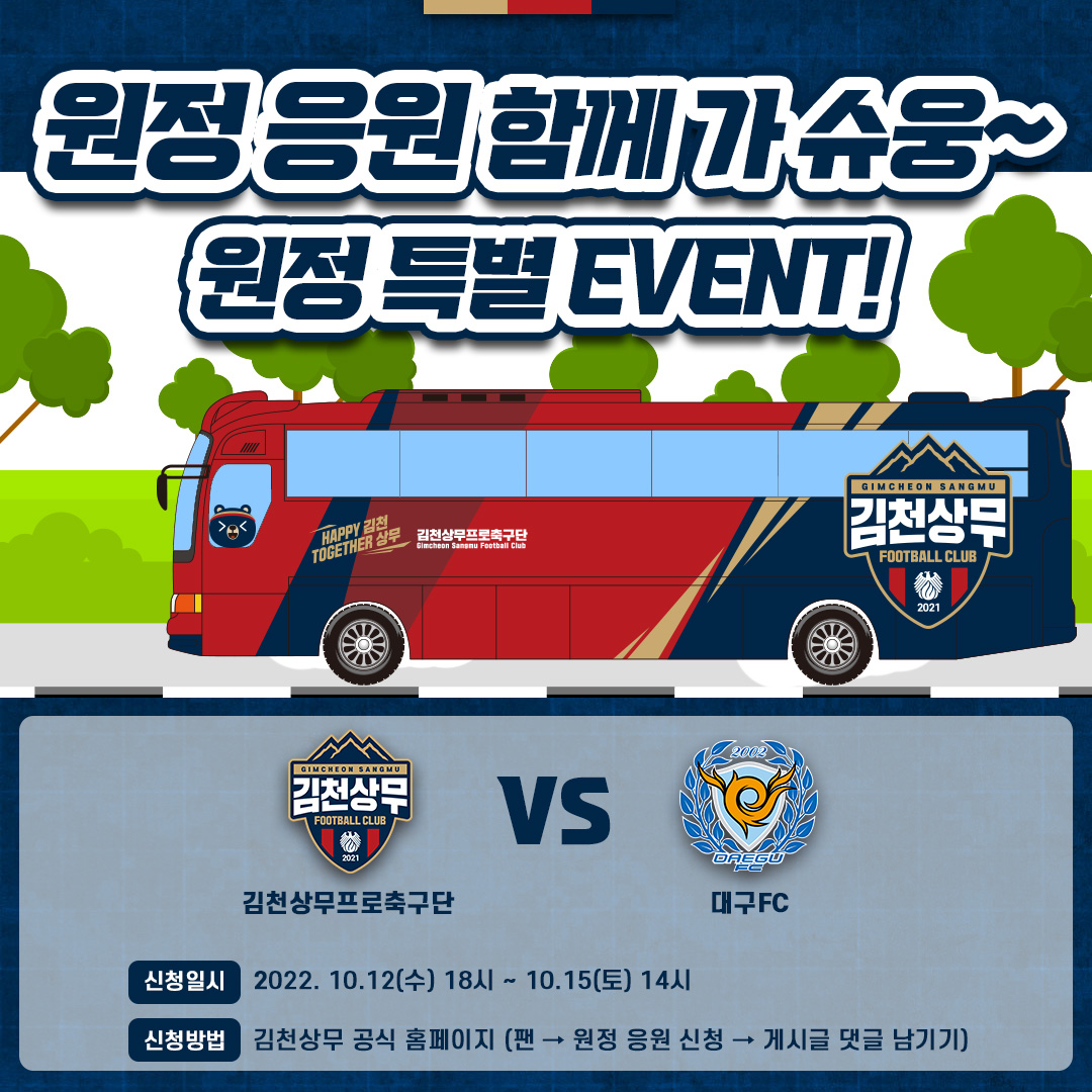 김천상무프로축구단(대표이사 배낙호)이 오는 16일 DGB대구은행파크에서 대구FC와 ‘하나원큐 K리그1 2022’ 37R 원정경기를 치른다. 원정 경기를 앞두고 김천은 12일 오후 6시부터 15일 오후 2시까지 원정 버스 탑승객을 모집한다. 지난 2일 수원FC전, 12일 서울, 16일 대구까지 세 경기 모두 원정 버스에 탑승해 응원에 참여하는 팬 전원에게 홈 유니폼을 제공한다.