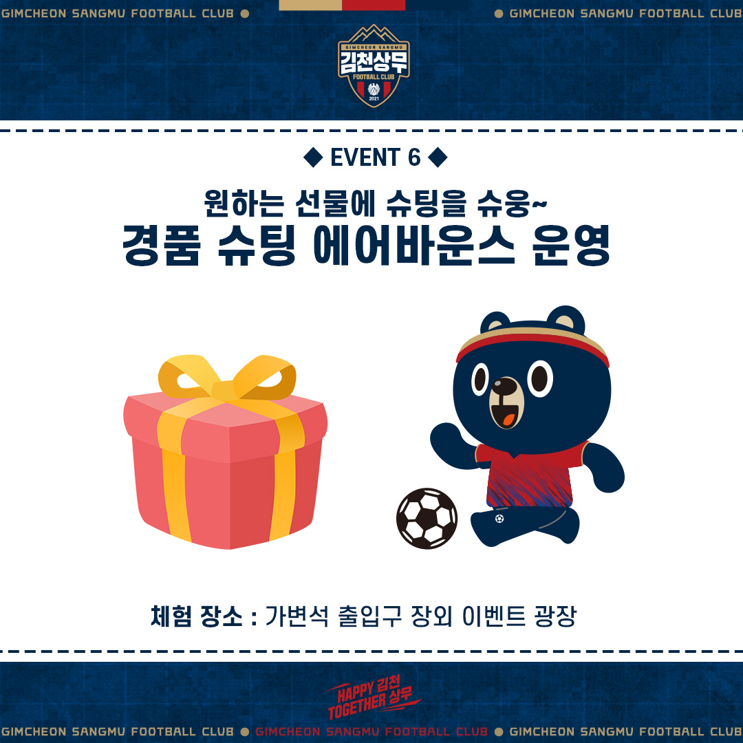 장외에서는 김천상무의 승리와 잔류를 기원하며 ‘경품 슈팅 에어바운스’ 이벤트를 진행한다. 사인볼, 인형, 쿠션 등 다양한 MD 상품이 적힌 곳을 향해 슈팅하고 성공 시 해당 MD를 증정한다. 김천상무 공식 유튜브 구독 시에는 구단 텀블러를 증정한다. 팬과 함께하는 득점 연계 마스크 기부 캠페인도 예정돼있다.