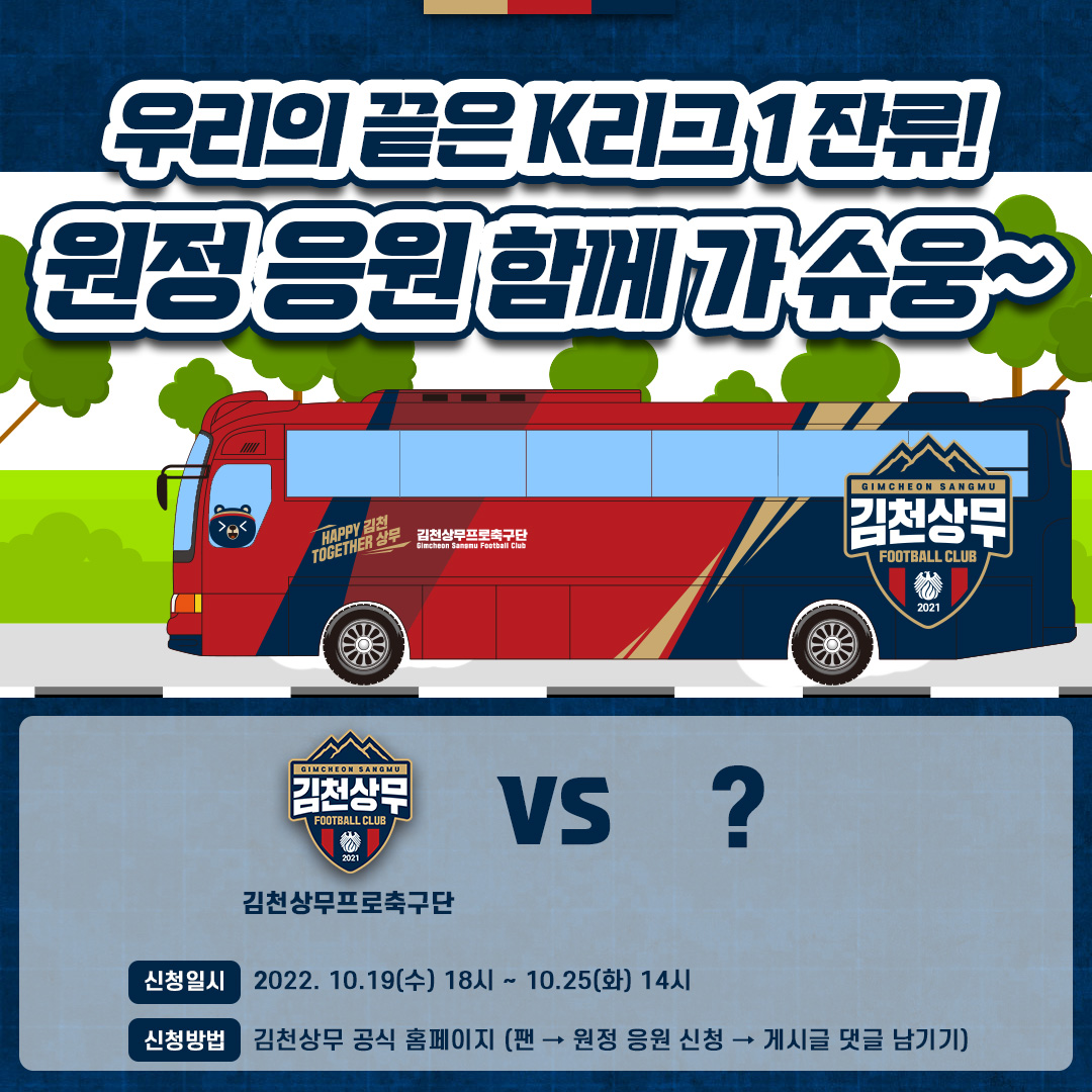 김천이 있어야 할 곳은 K리그1. 김천상무가 K리그1 잔류가 걸린 원정경기에서 함께 응원할 팬을 모집한다.