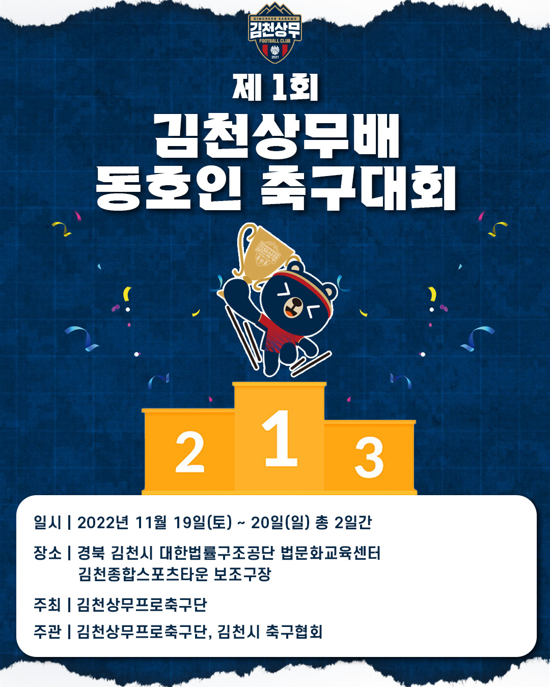 김천상무프로축구단(대표이사 배낙호)이 19일부터 20일까지 양 일 간 대한법률구조공단 법문화교육센터, 김천종합스포츠타운 보조구장에서 ‘제1회 김천상무배 동호인 축구대회’를 개최한다. 본 대회는 김천상무프로축구단이 주최하고 김천상무프로축구단, 김천시 축구협회가 주관한다.