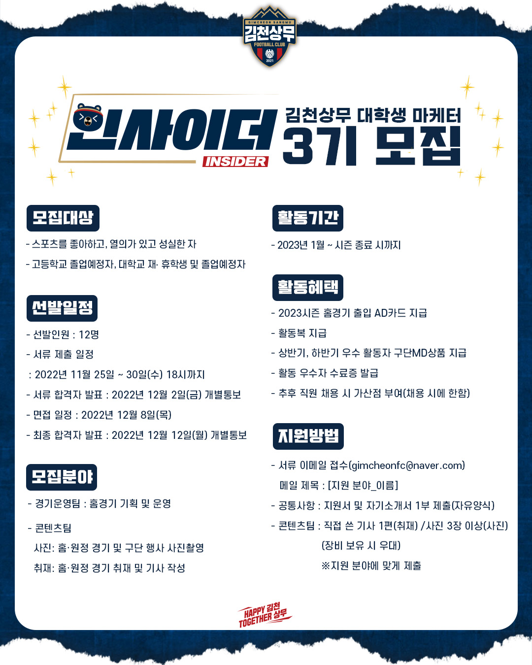 인사이더 모집 기간은 11월 25일(금)부터 30일(수) 오후 6시까지다. 스포츠를 좋아하고 열의가 있는 고등학교 졸업예정자, 대학생(휴학생 포함), 졸업예정자가 지원 대상이다. 경기운영팀, 콘텐츠 팀으로 나눠 모집하며 공통적으로 지원서(구단 양식)와 자기소개서(자유 양식)를, 콘텐츠 팀의 경우 지원 분야에 맞게 기사 1편, 사진 3장, 영상 1편을 추가 제출해야 한다. 서류 접수는 구단 공식 이메일(gimcheonfc@naver.com)로 가능하다.