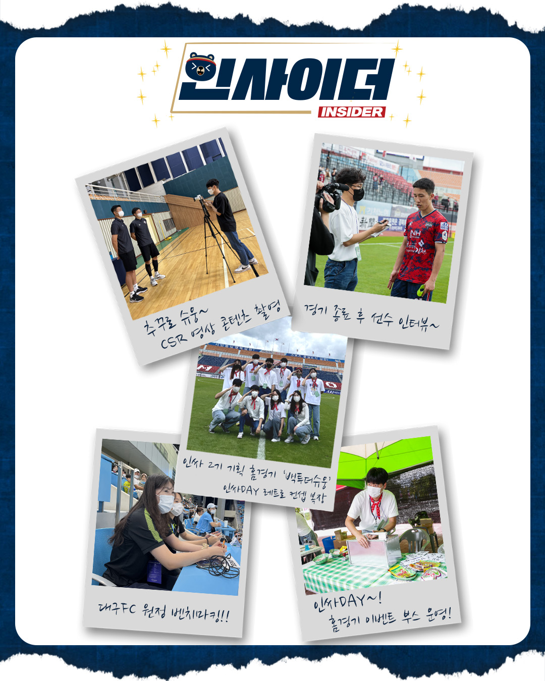 모집 분야는 경기운영팀 8명, 콘텐츠 팀 각 취재 2명, 사진 2명이다. 경기운영팀은 홈경기 운영 지원, MD샵, 안내데스크, 이벤트 부스 운영 등을 맡으며 콘텐츠팀은 홈, 원정 경기 콘텐츠를 제작할 예정이다. 콘텐츠팀 사진 지원자는 장비 보유 시 우대한다. 인사이더 3기에게는 2023시즌 AD카드, 활동복 지급, 실무 경험 기회 제공, 최우수 수료자 선정 및 기념품 증정 등 혜택이 제공된다. 또한 추후 직원 채용 시 가산점을 부여한다.
