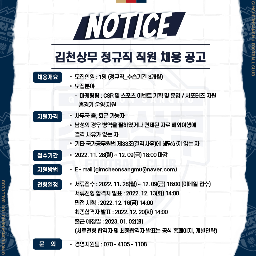김천상무가 2023시즌을 함께할 정규직 직원을 공개 채용한다.