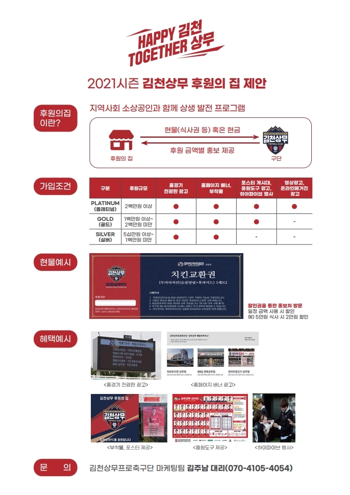 김천상무프로축구단(대표이사 배낙호)이 2021 시즌 후원의 집 모집을 시작했다. 후원의 집이란 지역사회 소상공인과 함께 상생, 발전하는 프로그램으로 구단은 후원의 집에게 후원 금액 별 홍보를 제공하고 후원의 집은 구단에게 현물(식사권 등) 혹은 현금을 제공한다.