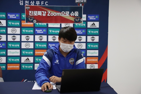 온라인으로도 사회공헌활동을 통해 팬들을 만났다. 김천상무가 매달 시행하고 있는 ‘진로특강; Zoom으로 슈웅’ 홈경기 운영 담당자인 김주남 대리가 오후 2시부터 스포츠산업 취업을 희망하는 학생들에게 강의를 진행했다.