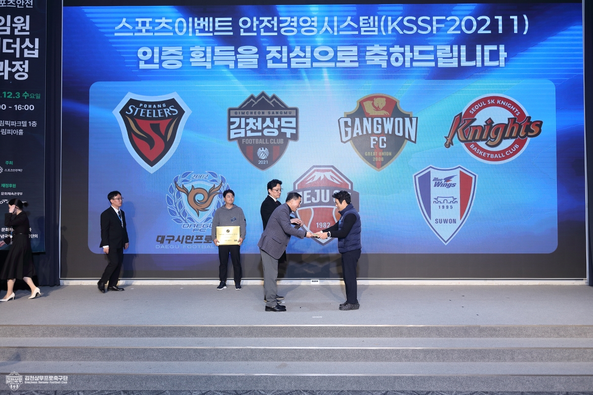 김천상무프로축구단(대표이사 이재하)이 12월 3일 서울 송파구 올림픽 파크텔에서 열린 스포츠안전재단의 스포츠이벤트 안전경영시스템(KSSF20211)을 인증받았다.
