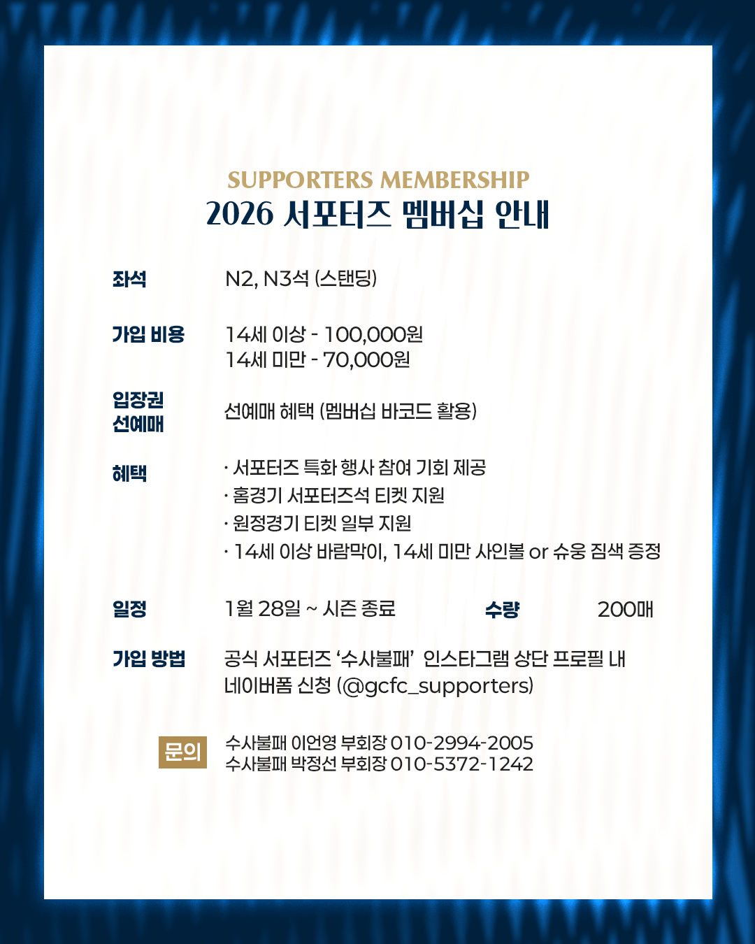 서포터즈 멤버십 가입은 ‘수사불패’ 공식 인스타그램(@gcfc_supporters) 프로필 상단에 안내된 네이버폼을 통해 신청할 수 있다. 가입 관련 문의는 수사불패 SNS에 게시된 관련 안내글 내 수사불패 임원진 연락처를 통해 가능하다.