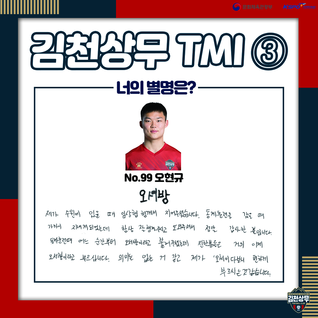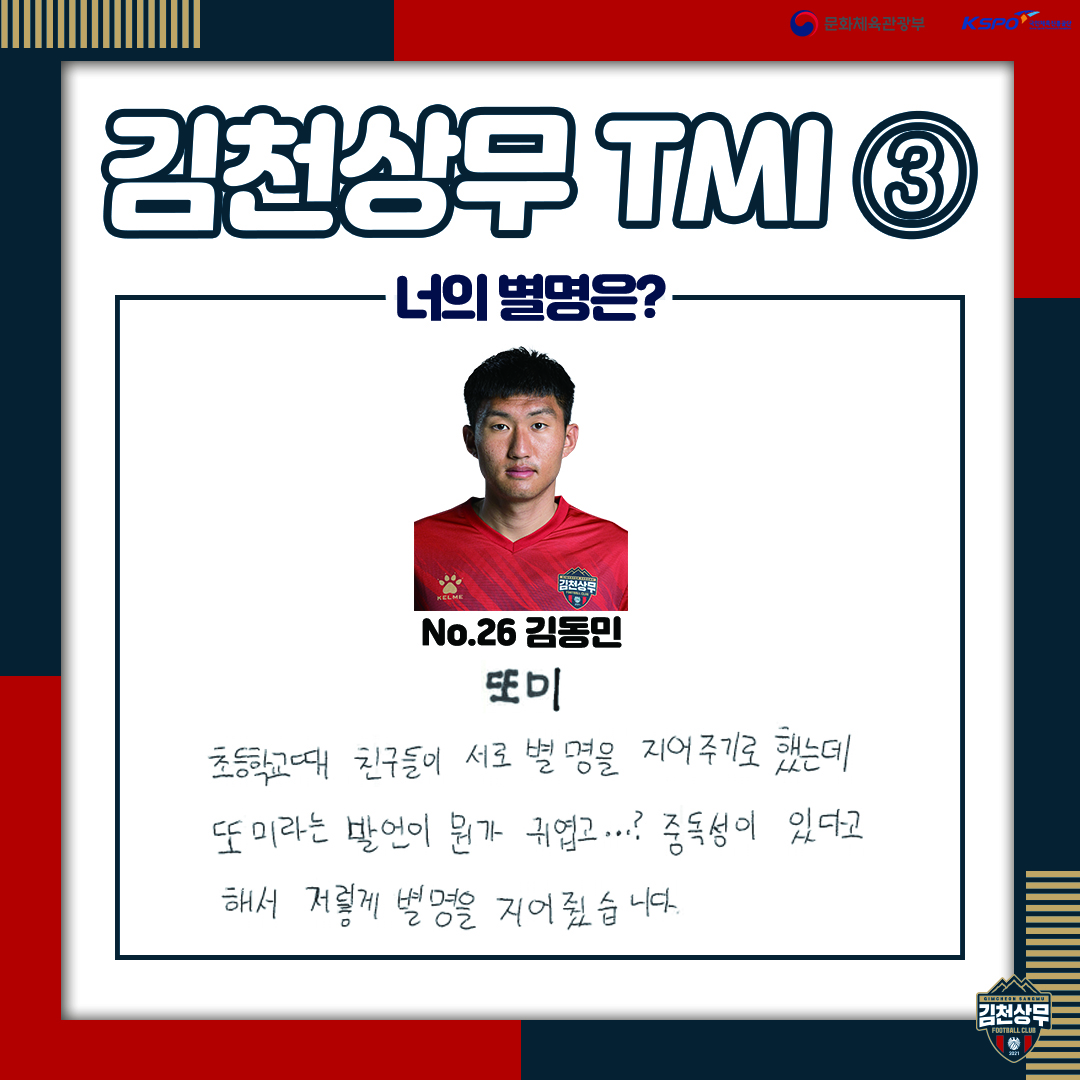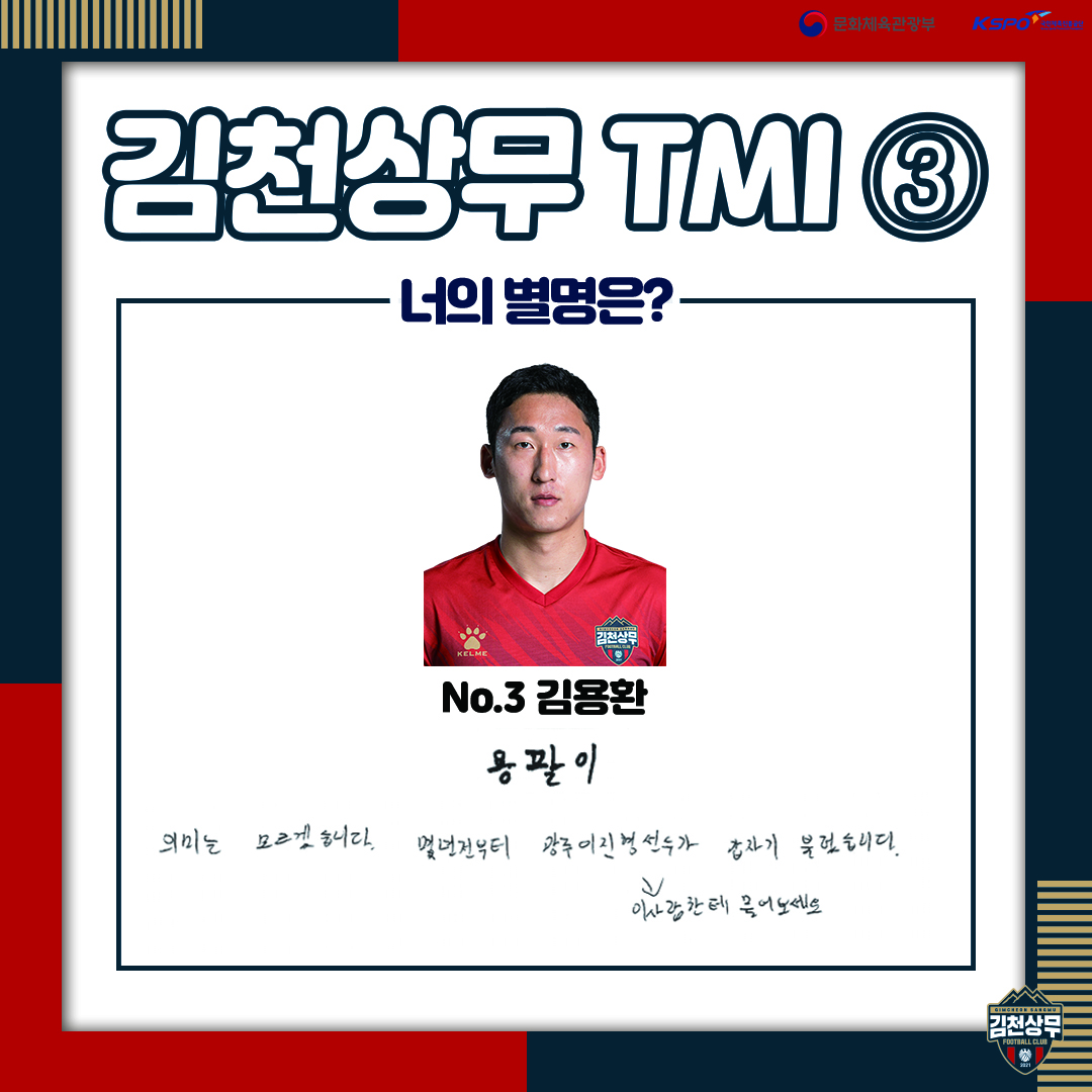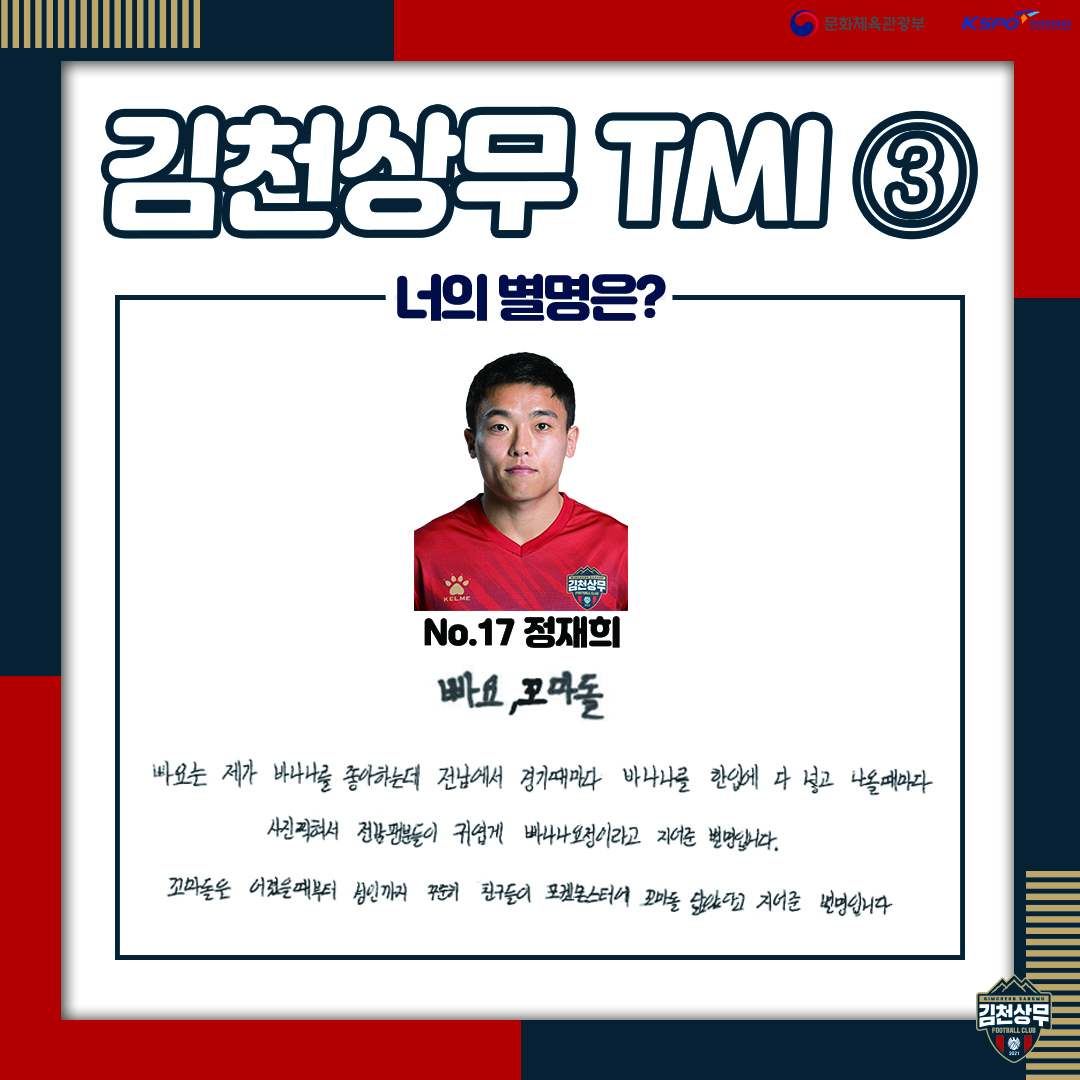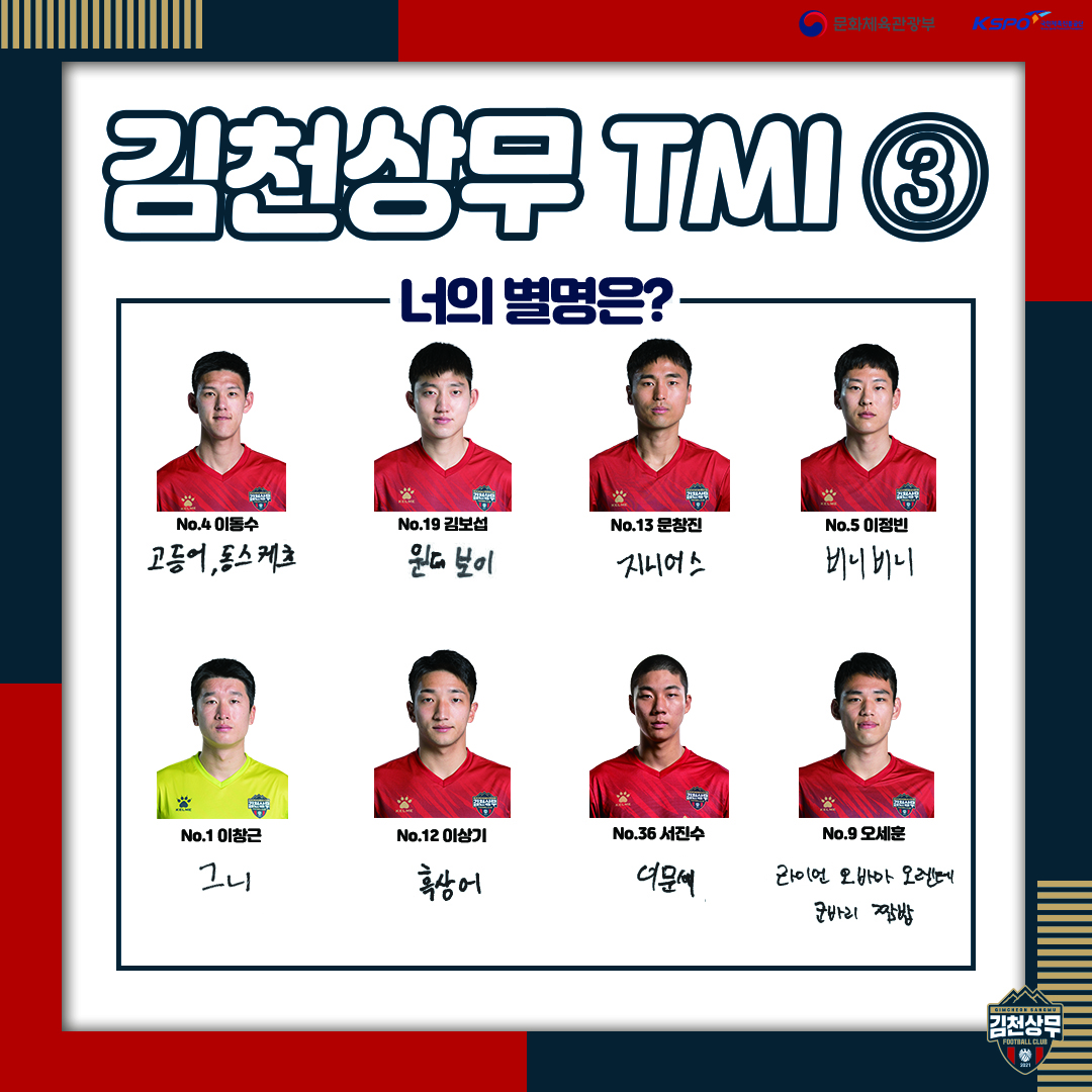 김천상무는 매주 목요일, 베일에 싸인 선수들의 TMI(Too Much Information)를 낱낱이 파헤치는 팬 프렌들리 ‘김천상무 TMI’ 자료를 배포할 예정이다. 모든 자료는 선수들이 직접 답변한 자료를 바탕으로 한다. 세 번째는 별명이다.