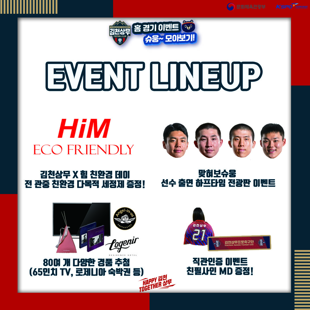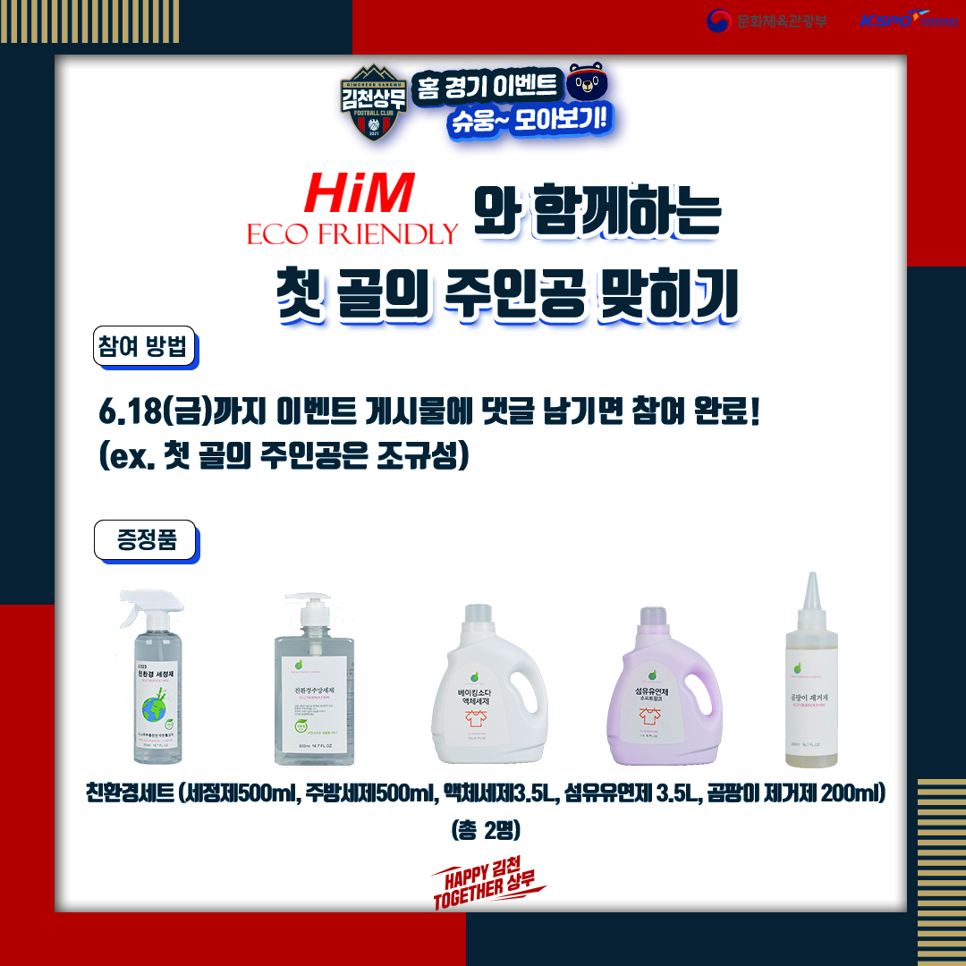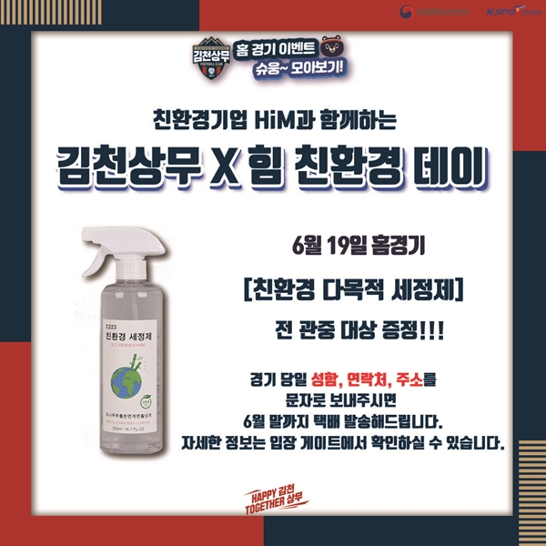 김천상무는 환경의 달을 맞아 친환경 기업 HiM과 함께하는 김천상무 X HiM 친환경데이 이벤트를 진행한다. 전 관중을 대상으로 친환경 다목적 세정제(500ml)를 증정한다. 또한 친환경 세트(다목적 세정제, 주방세제, 액체세제, 섬유유연제, 곰팡이 제거제) 다섯 세트를 경품 추첨을 통해 제공한다.