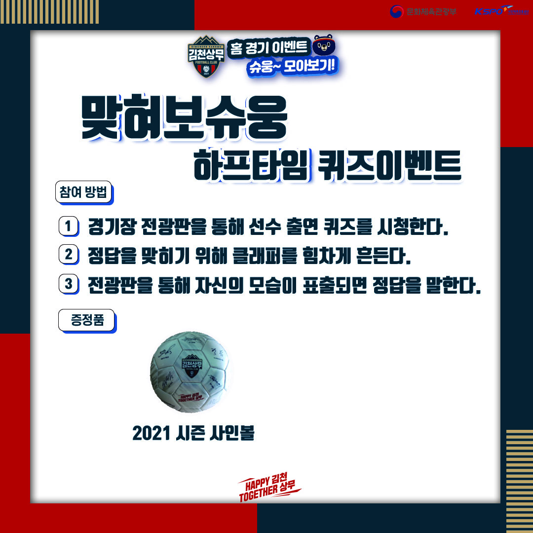 김천상무는 서울이랜드전 홈경기서 하프타임 전광판을 활용한 ‘맞혀보슈웅’ 이벤트를 실시한다. 권혁규, 오현규, 전세진이 나와 다양한 미션을 시행한다. 전광판을 보고 팬들은 미션을 맞힌 팬에게는 2021 시즌 사인볼이 제공된다.