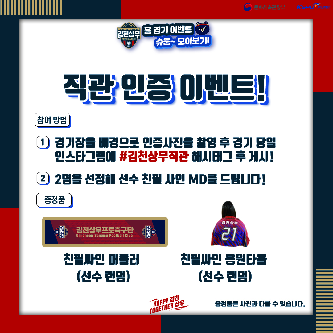직관인증 이벤트도 실시한다. 경기장 입장 후 경기장 배경으로 인증사진 촬영 후 인스타그램에 #김천상무직관 해시태그를 포함해 게시하면 2명을 선정해 친필싸인 MD를 제공한다. 김천상무 공식 인스타그램으로 당첨자를 공지할 예정이다.