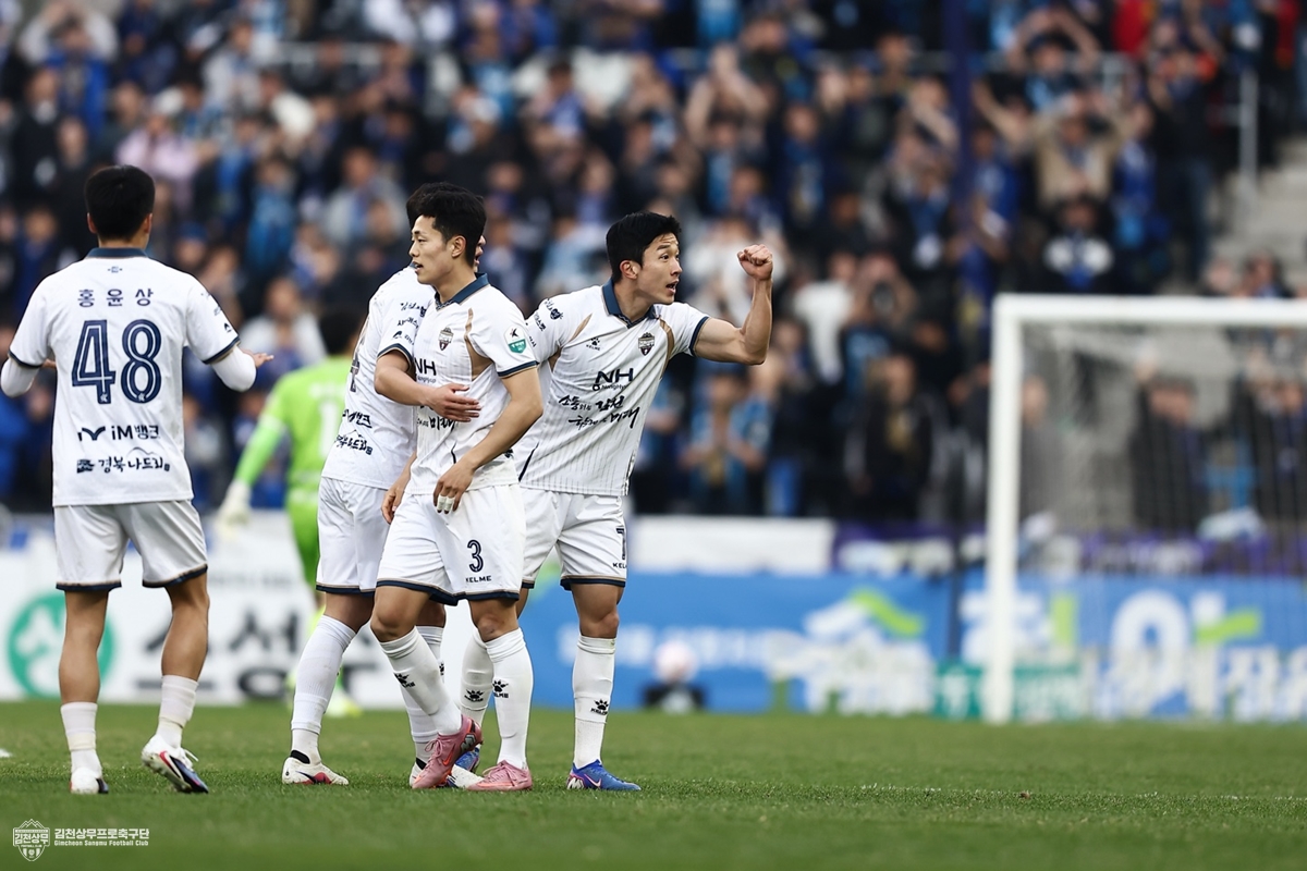김천상무프로축구단(대표이사 이재하)이 4월 5일 일요일 16시 30분, 인천축구전용경기장에서 열린 ‘하나은행 K리그1 2026’ 6R 원정경기에서 인천유나이티드(이하 인천)에 1대 2로 패하며 아쉬움을 남겼다.