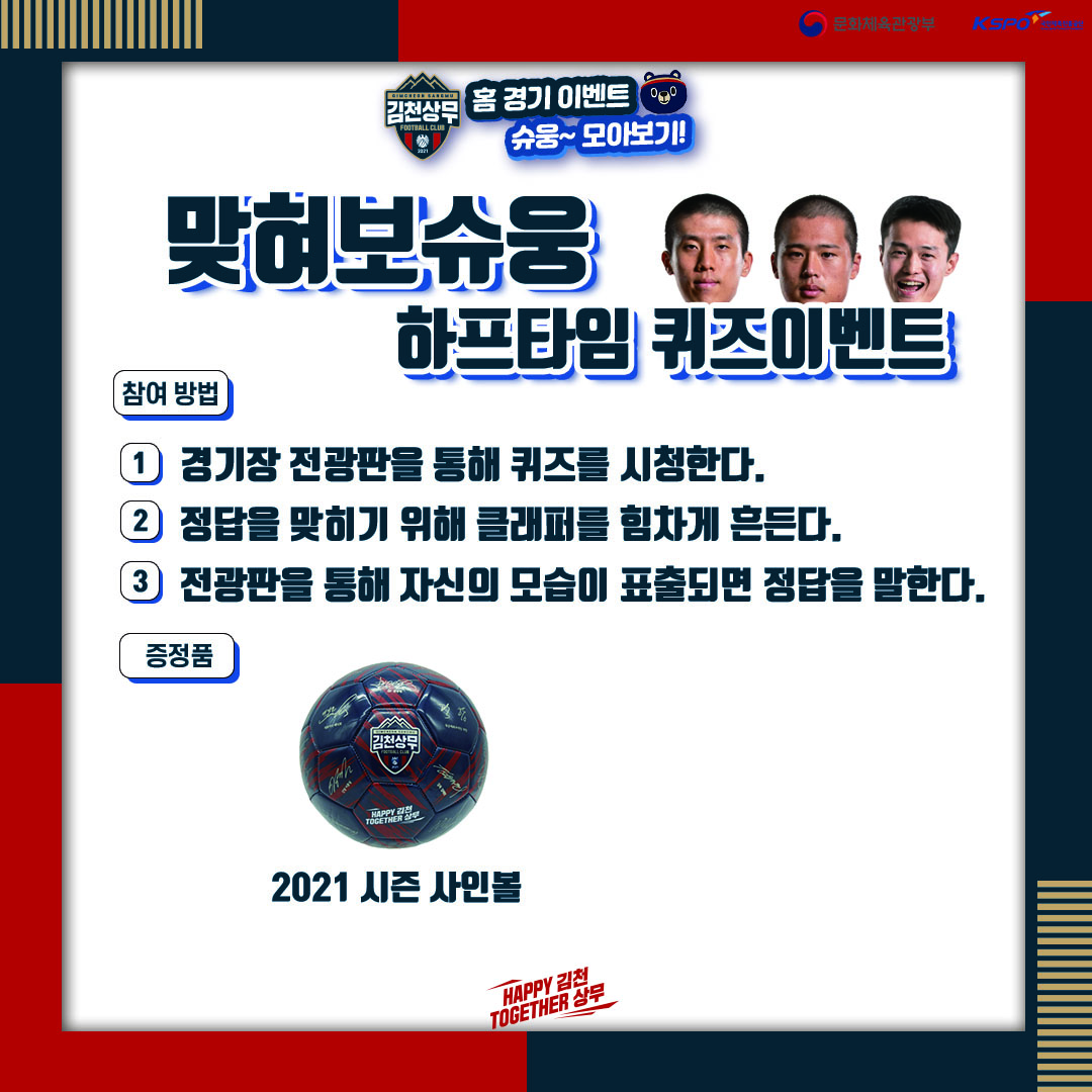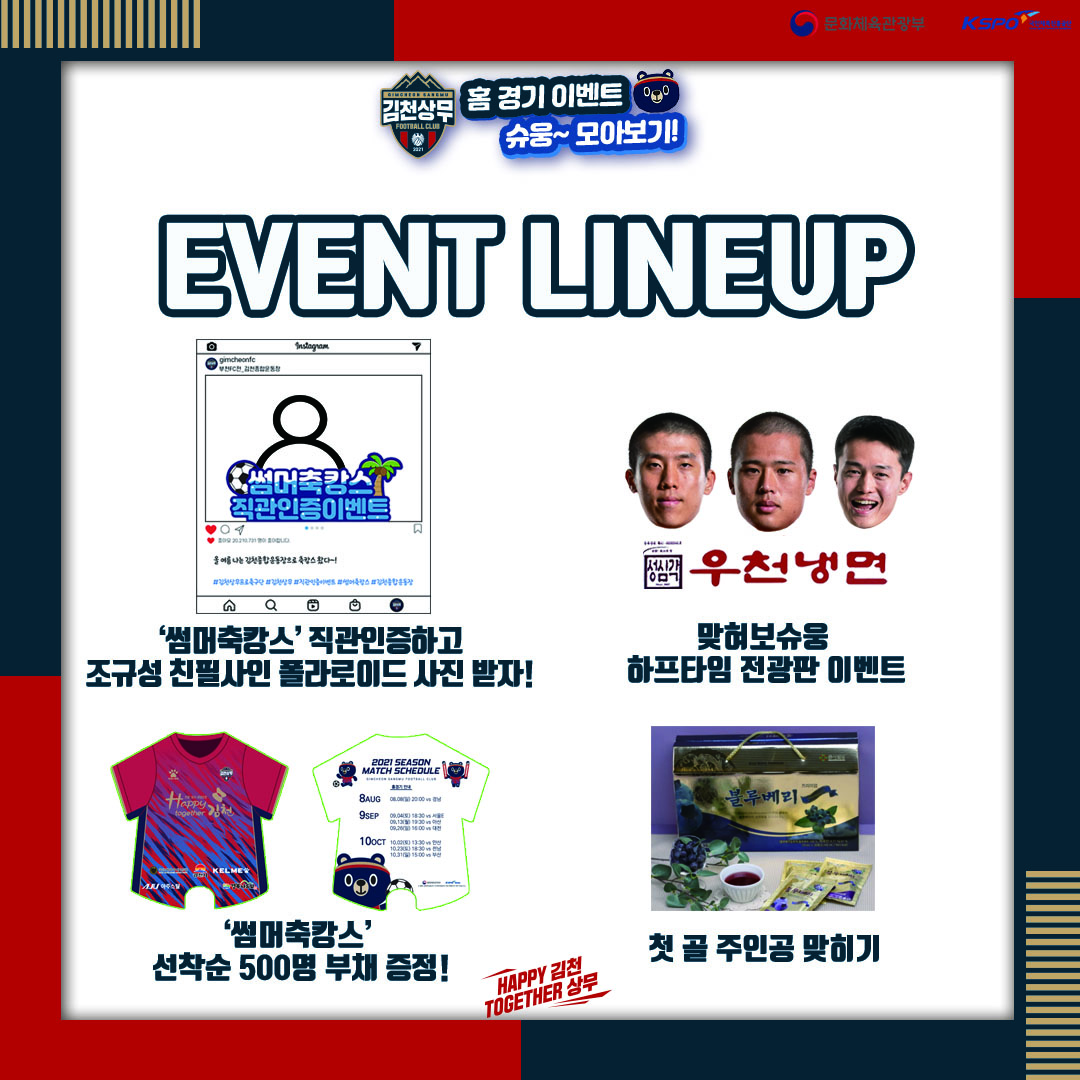 김천상무프로축구단(대표이사 배낙호)이 31일 오후 8시 김천종합운동장에서 ‘하나원큐 K리그2 2021’ 23R 부천FC와 홈경기를 치른다. 무더위를 날리기 위한 ‘썸머축캉스’ 컨셉으로 김천은 홈경기에서 다양한 팬 프렌들리 행사를 진행한다.