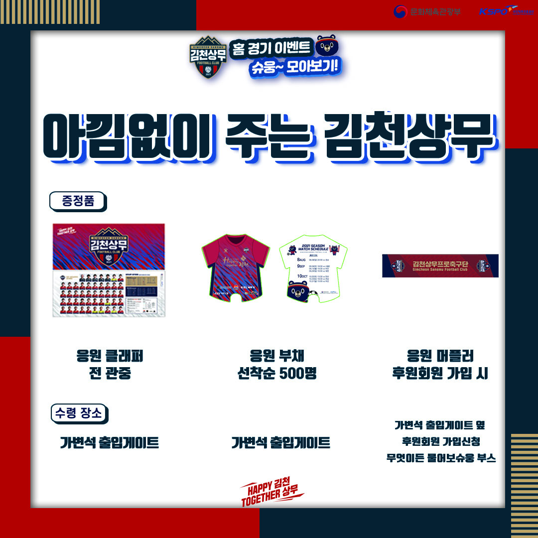 무더위 해소를 위해 김천상무는 선착순 500명에게 입장 시 부채를 증정한다. 전 관중에게는 응원용 클래퍼를 제공한다.
