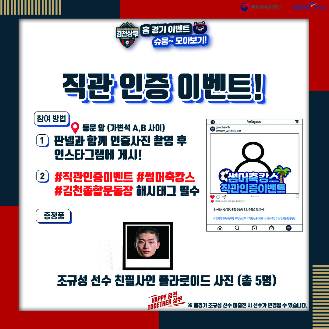 동문 앞(가변석 A, B 사이)에서는 경기 시작 전부터 경기 종료 이후까지 포토 판넬과 함께 사진을 촬영할 수 있다. 직관인증 이벤트 존에서 촬영 후 경기 당일까지 인스타그램에 #직관인증이벤트 #썸머축캉스 #김천종합운동장 해시태그를 포함해 게시하면 5명을 선정해 조규성 친필사인 폴라로이드 사진을 증정한다. 조규성 홈경기 미 출전 시 선수가 변경될 수 있다. 당첨자는 김천상무 공식 인스타그램을 통해 공지할 예정이다.