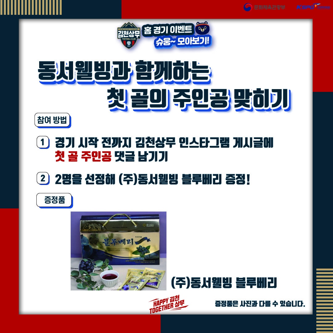 동서웰빙과 함께하는 첫 골의 주인공 맞히기 이벤트도 진행된다. 김천상무 인스타그램 게시물에 경기 시작 전까지 댓글을 남기면 당첨자에 한해 추첨을 통해 2명에게 블루베리 즙을 증정한다.