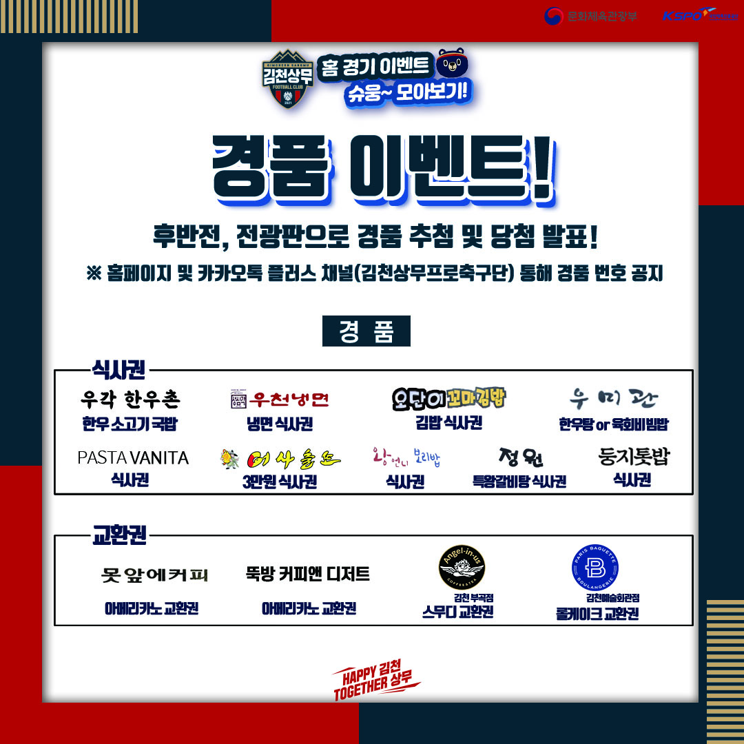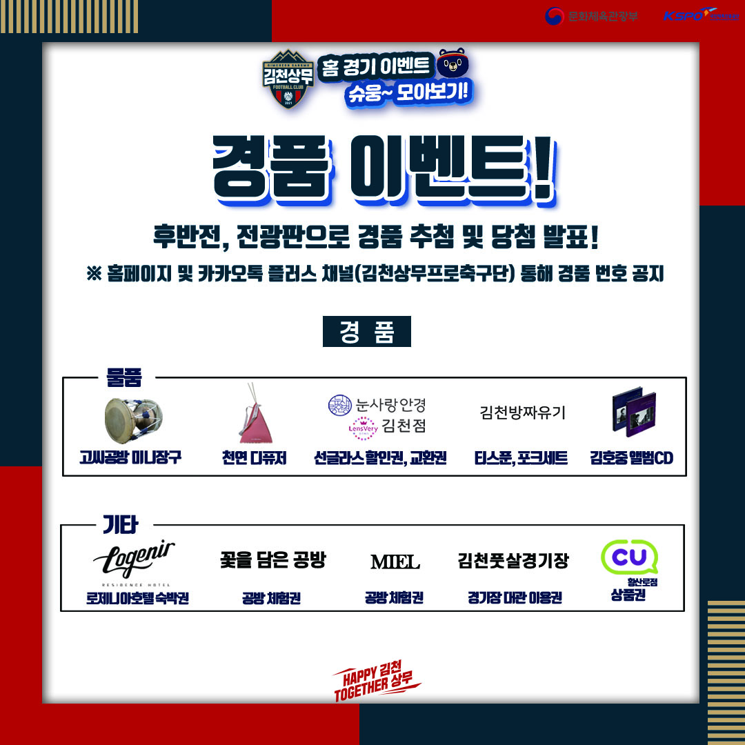 경품 추첨 이후 전광판에 경품 당첨자를 표출하며 김천상무 홈페이지, 카카오톡 플러스 채널을 통해 당첨자 번호를 공지할 예정이다.