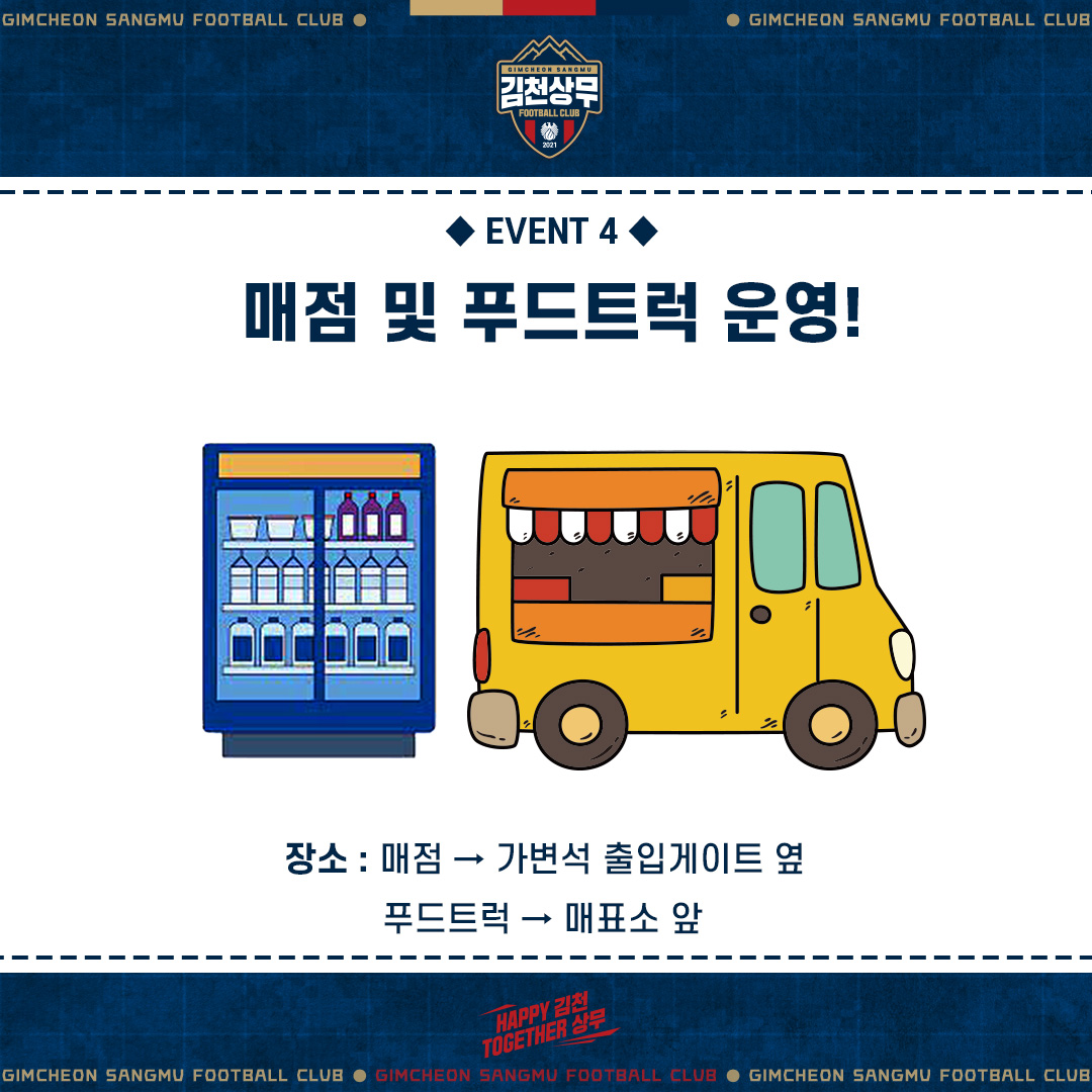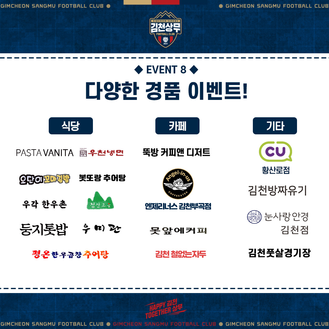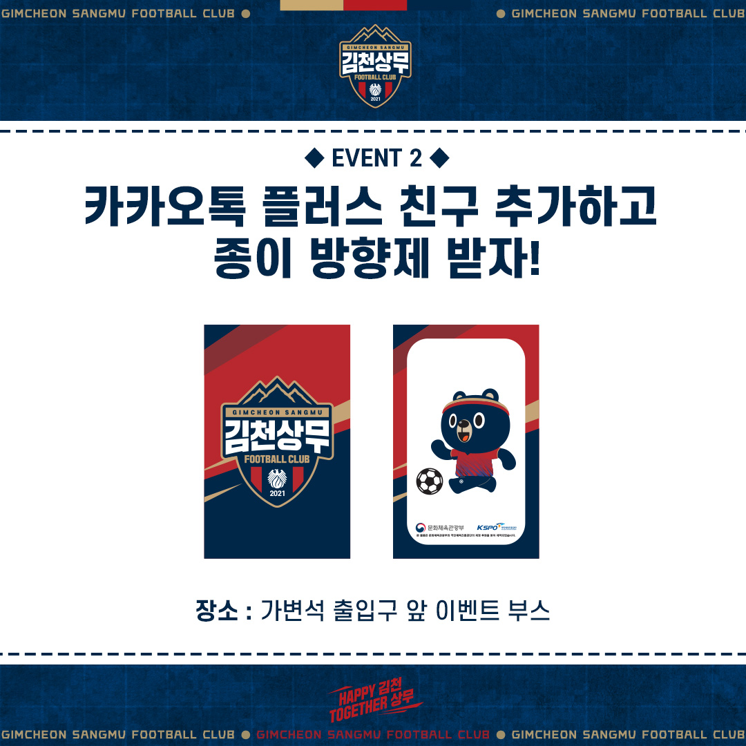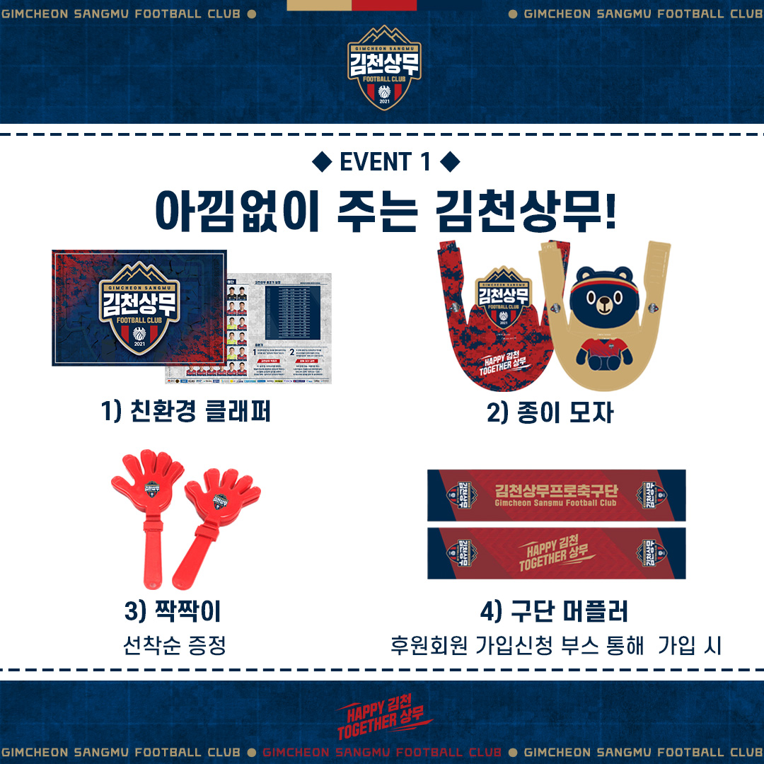 김천상무는 전 관중에게 응원용 클래퍼, 종이모자를 증정한다. 가변석 관중 대상으로 선착순 200명에게는 김천상무 짝짝이를 제공한다. 가변석 출입구 앞 이벤트 부스에서는 카카오톡 플러스 친구 추가 및 인증 시, 선착순으로 김천상무 종이 방향제를 증정한다.