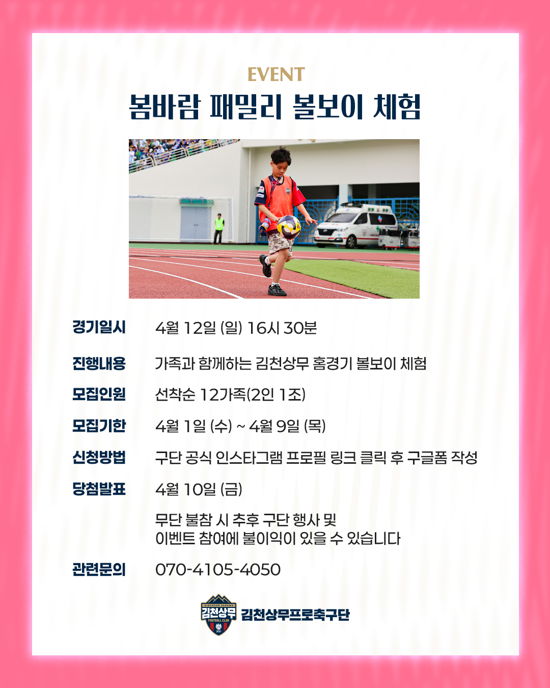 김천상무는 오는 홈경기 완연한 봄을 알리는 이벤트로 홈팬을 맞이한다. 먼저 선수들과 함께하는 봄소풍 이벤트가 열린다. 사전 모집된 총 30팀을 대상으로 진행되며, 선수들과 함께하는 포토타임, 피크닉 세트 증정, 레크리에이션을 즐길 수 있다. 신청 마감은 4월 8일까지다. 이어 4월 9일까지 구단 SNS를 통해 신청 시 패밀리 볼보이 체험, 봄 Kick Off 가족 시축, 패밀리 에스코트 등 다양한 이벤트에 참여할 수 있다.